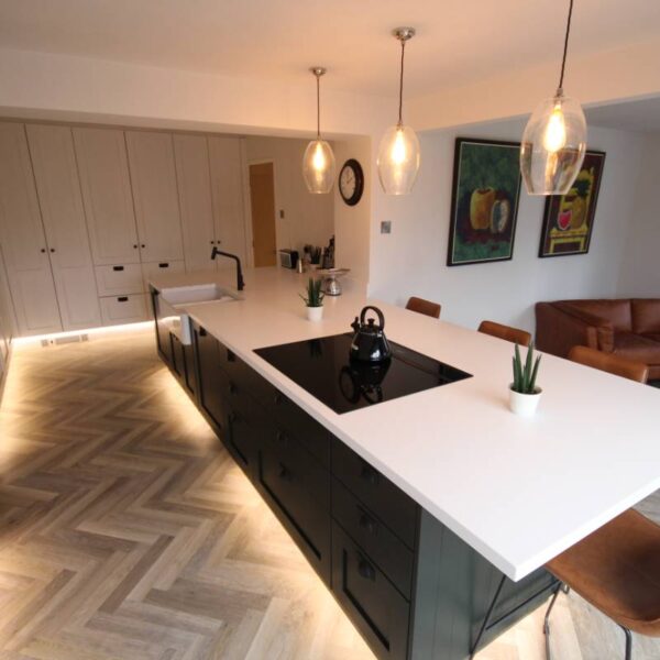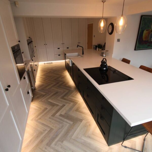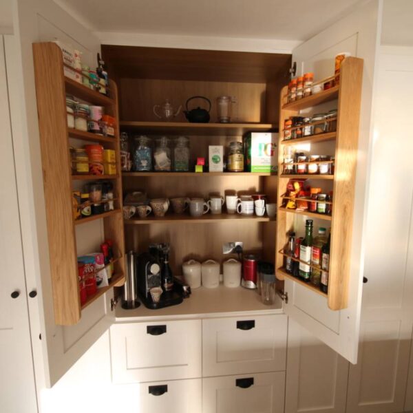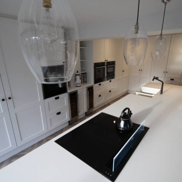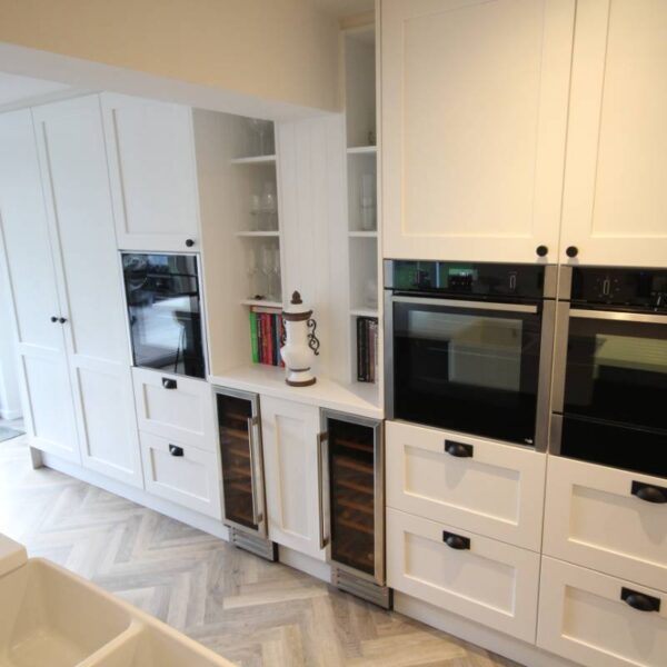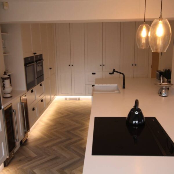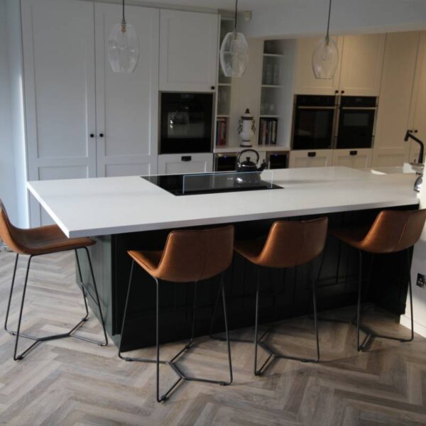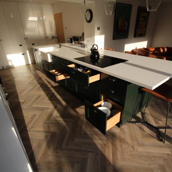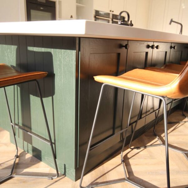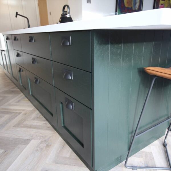 We designed a large island unit with an L shaped breakfast bar with seating for 4; featuring a Belfast sink, hob and down draft extractor. The island also housed a dishwasher, pull-out bin and plenty of storage space in beautiful dovetail drawers and cupboards beneath the breakfast bar. At the sink end of the island unit, as the worktop was so wide, there was plenty of room for storage. A cupboard door would have spoilt the aesthetics of the unit, so we made a press to open door out of tongue and groove; cleverly disguising the storage as an end panel.