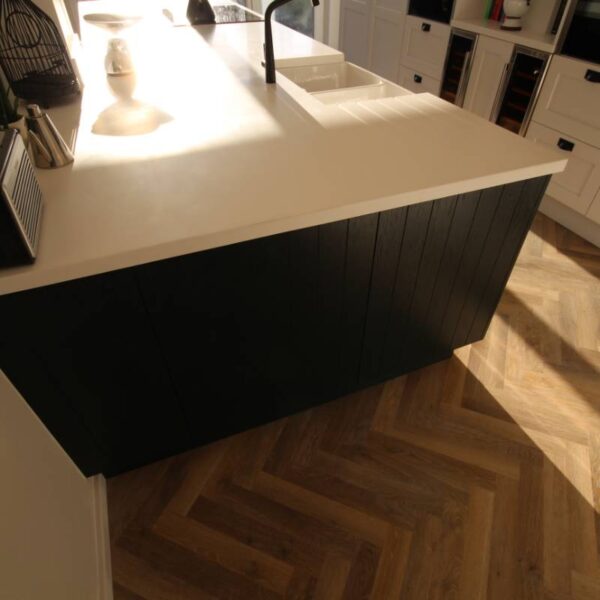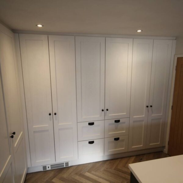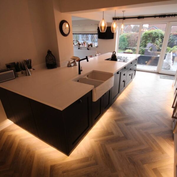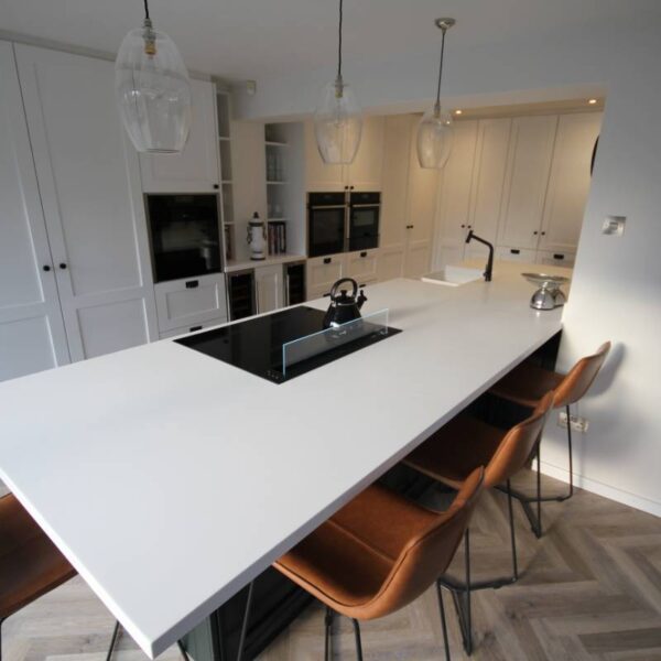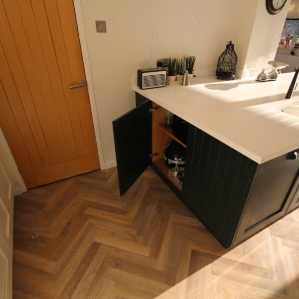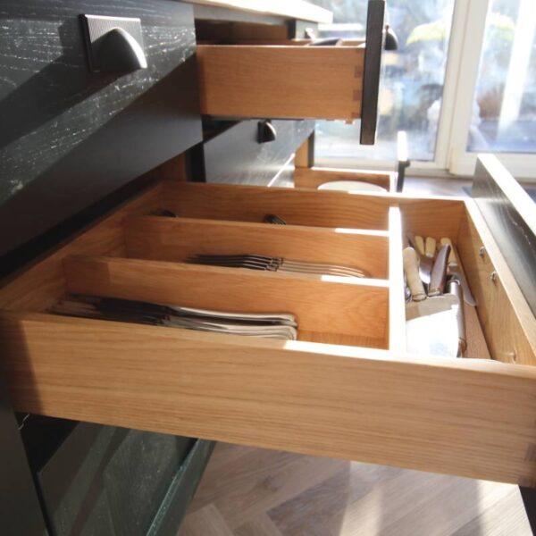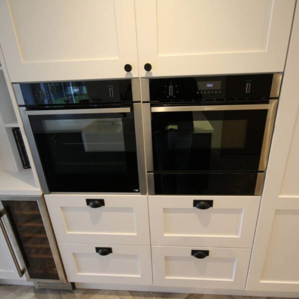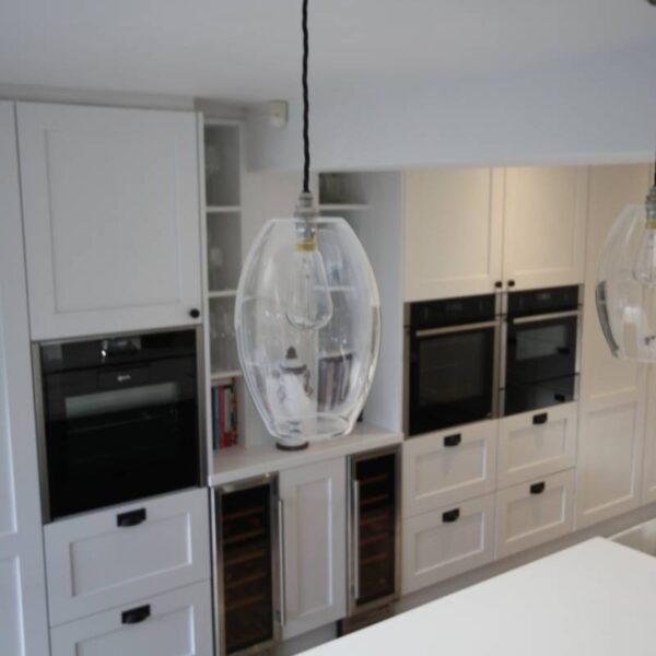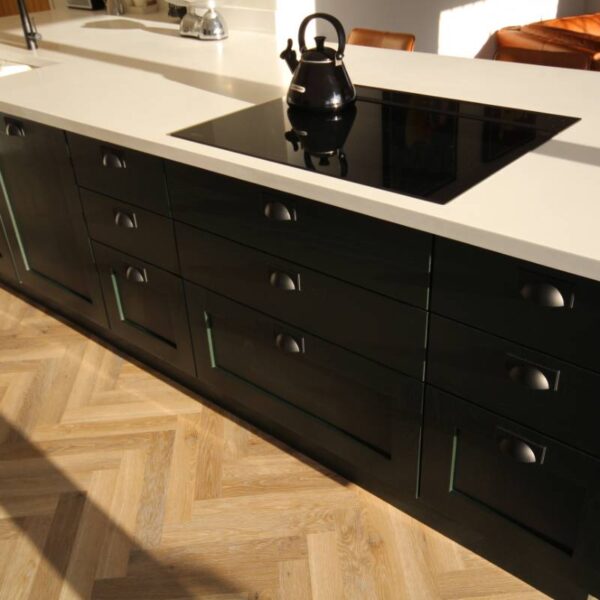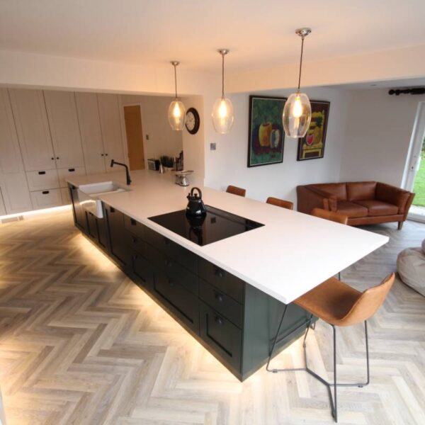 We designed a large island unit with an L shaped breakfast bar with seating for 4; featuring a Belfast sink, hob and down draft extractor. The island also housed a dishwasher, pull-out bin and plenty of storage space in beautiful dovetail drawers and cupboards beneath the breakfast bar. At the sink end of the island unit, as the worktop was so wide, there was plenty of room for storage. A cupboard door would have spoilt the aesthetics of the unit, so we made a press to open door out of tongue and groove; cleverly disguising the storage as an end panel.