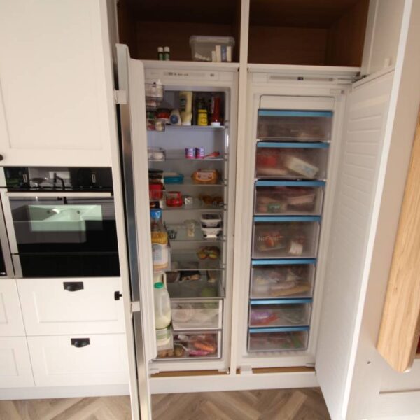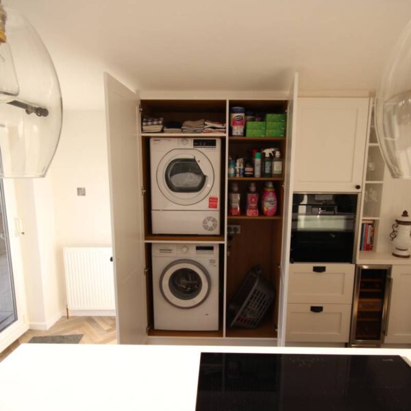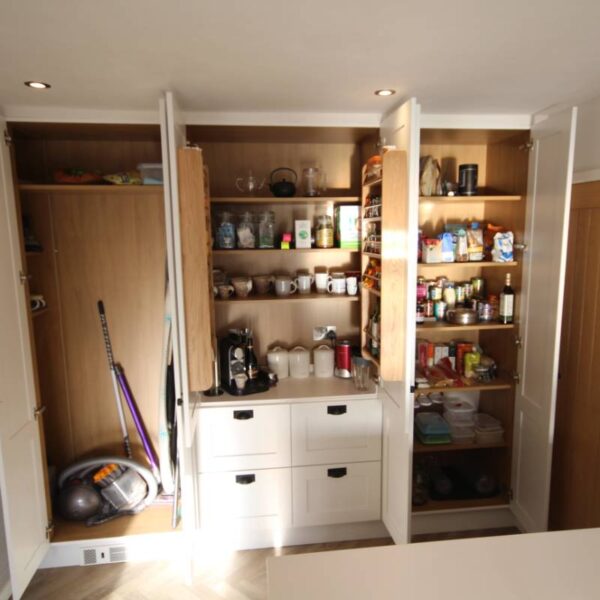 A bank of units along one of the walls housed a pantry unit (with extra worktop space inside), larder shelves and a broom cupboard. When the doors were closed it created beautiful symmetry with drawers from the pantry unit creating interest.