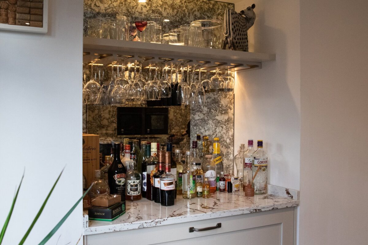 The bar area is a real showstopper with antique mirror detailing, floating shelves and hanging glass storage for evening entertaining. The space above the units was boxed in to create a modern look and a seamless finish.
