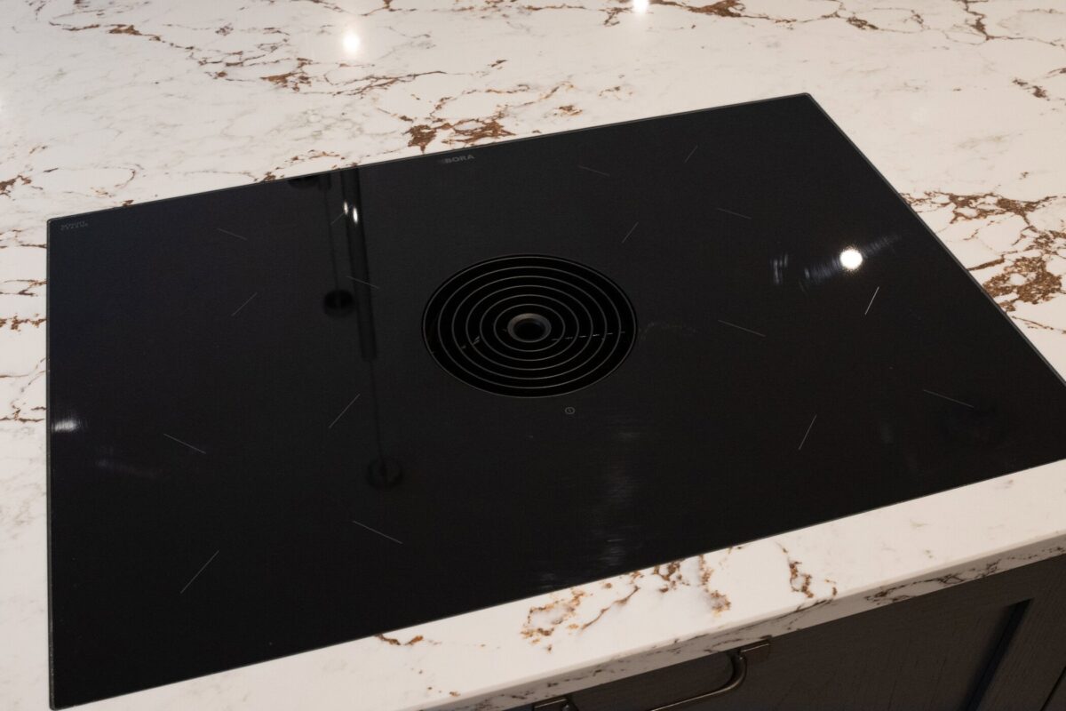 - The Bora Pure Recirculated Induction Cooktop is a true masterpiece of modern engineering. This integrated cooktop-extractor combination eliminates the need for overhead extraction, maintaining clean sight lines across the kitchen. The induction technology offers precise temperature control, while the integrated extractor quietly and efficiently removes cooking vapours at their source. Its flush mounting creates a seamless look with the bronze quartz worktop.