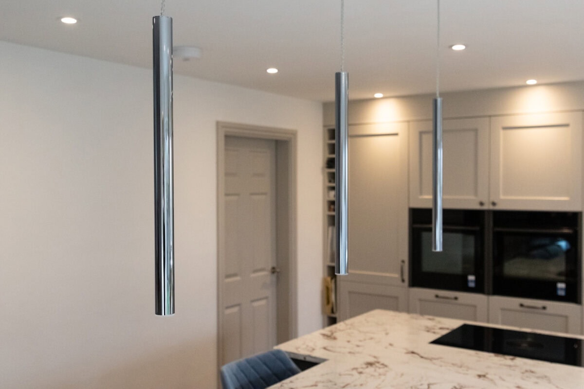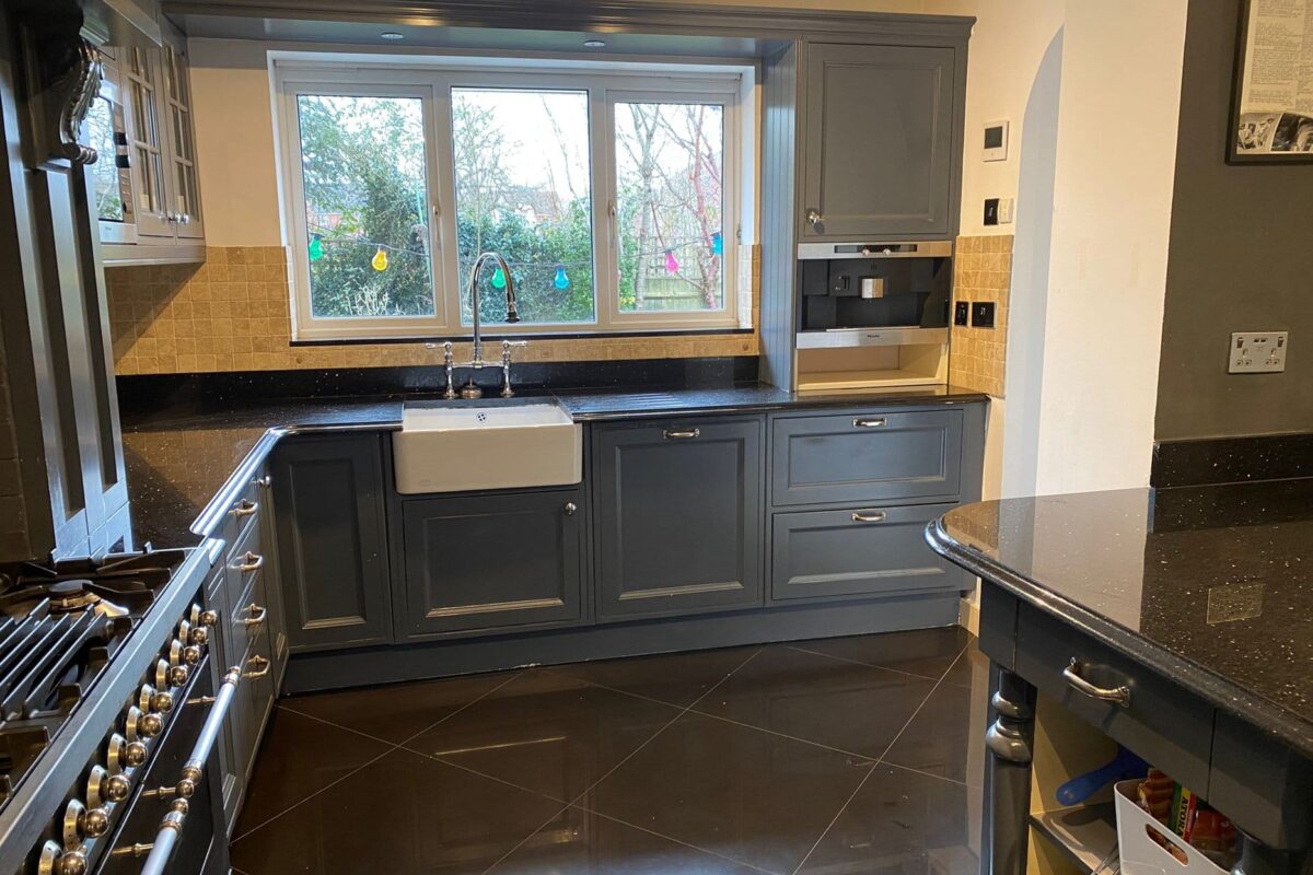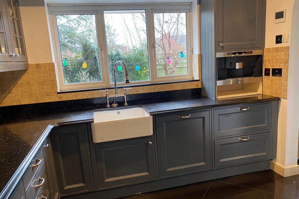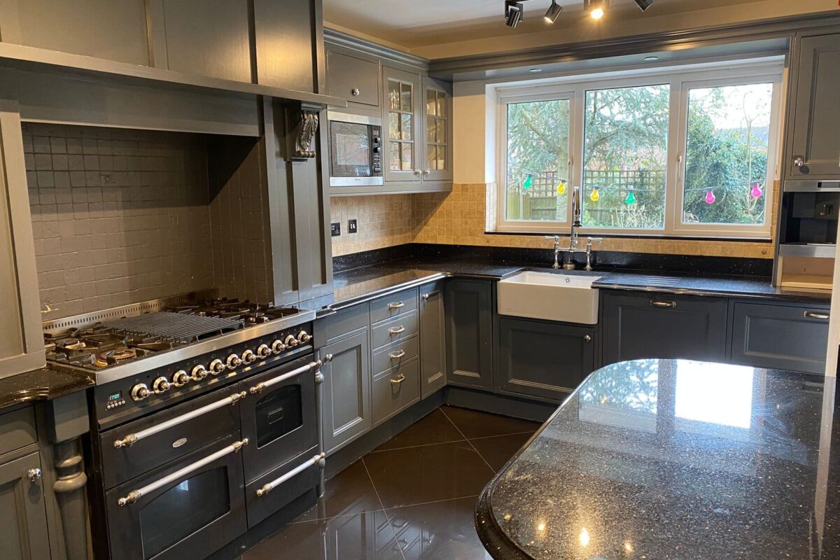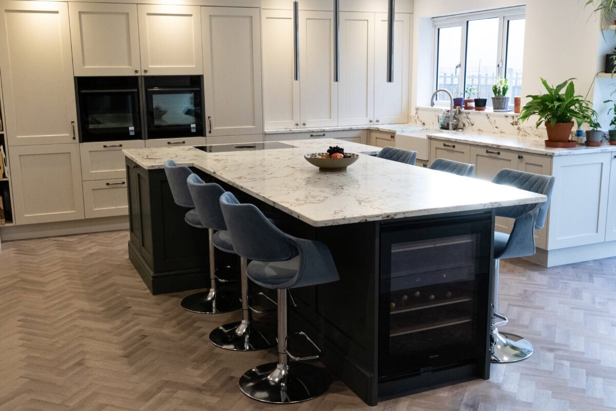 After the structural work had opened up the space with two steel beams, we set about creating a kitchen that balanced functionality with style. The focal point became a T-shaped island in dark grey to contrast with the main kitchen units in Lancaster Oak and Cashmere. This clever design created a natural hub for family time and entertaining guests.