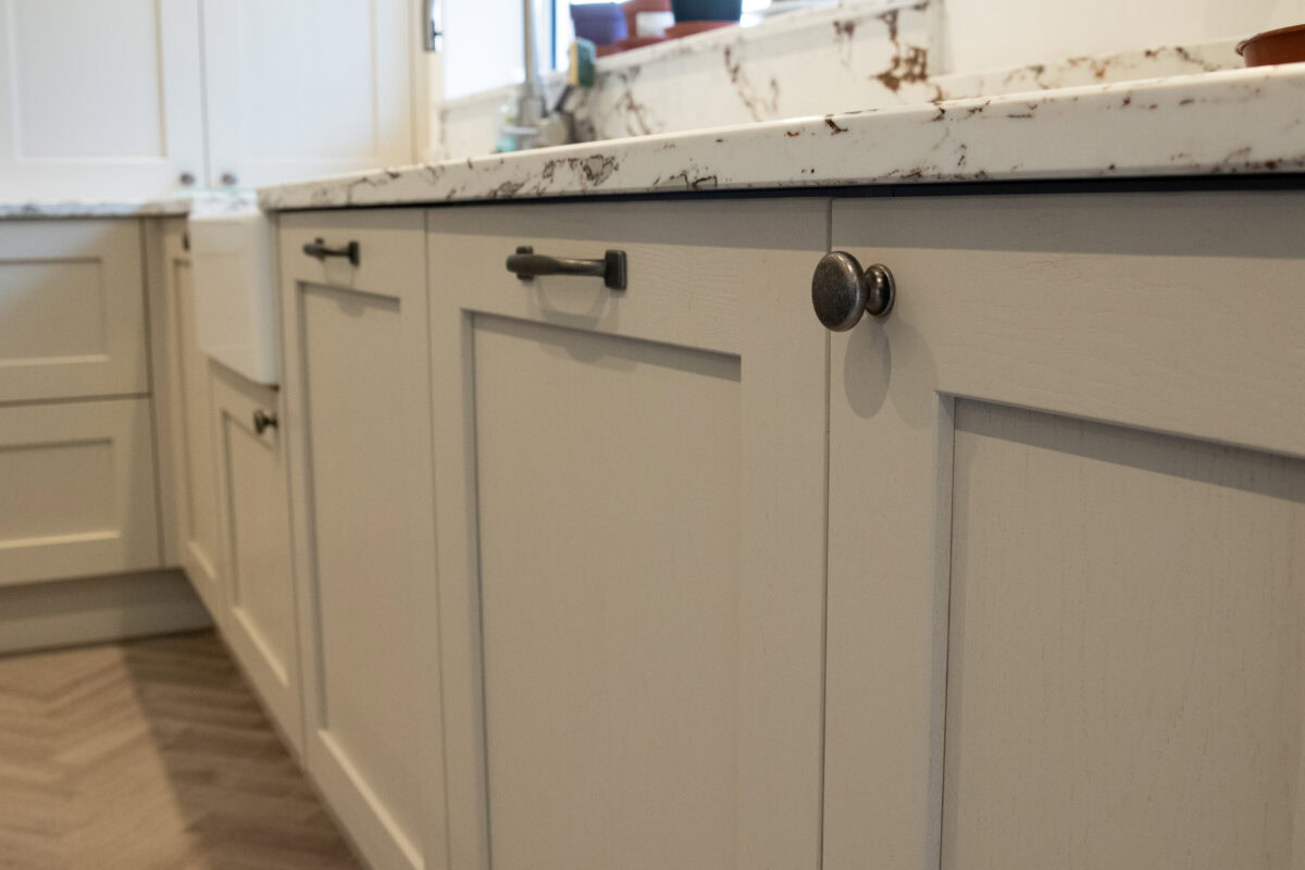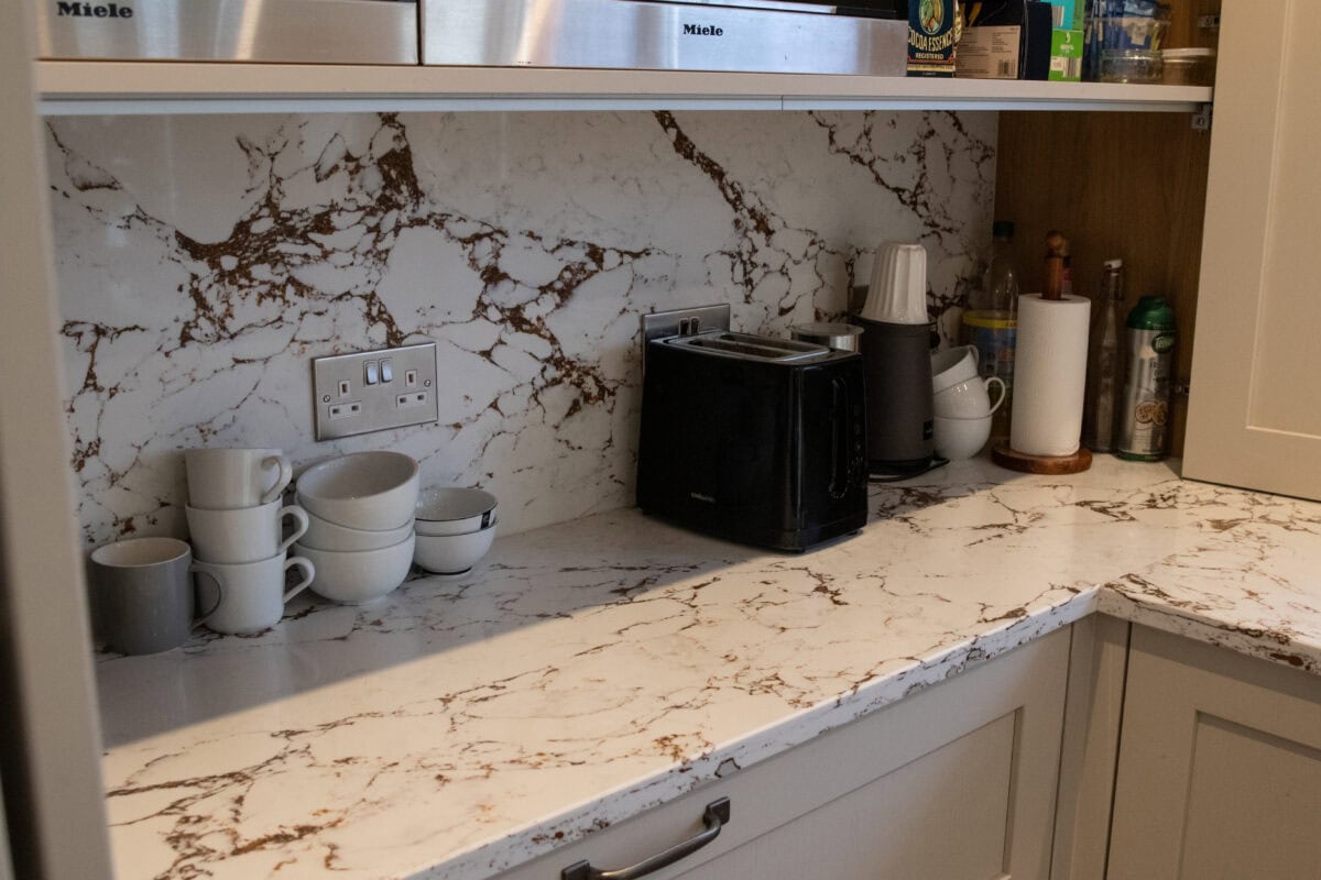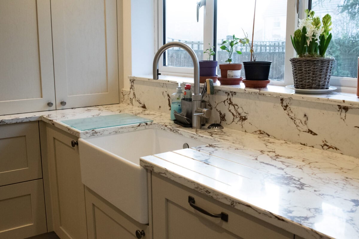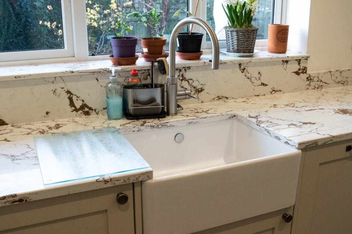 - Custom Drainer Grooves: Cut into the quartz beside the Belfast sink, these 5 straight grooves are functional and beautiful. Placed perfectly to drain and keep the worktop clean.