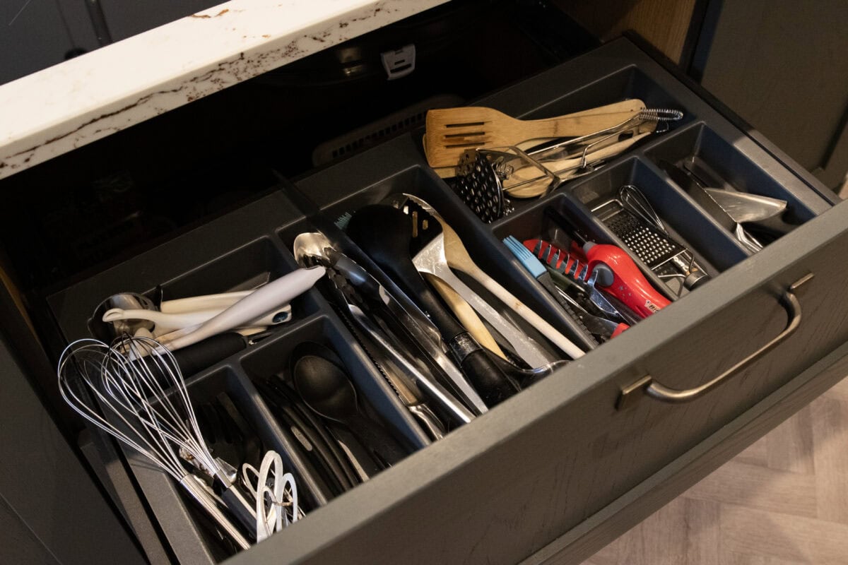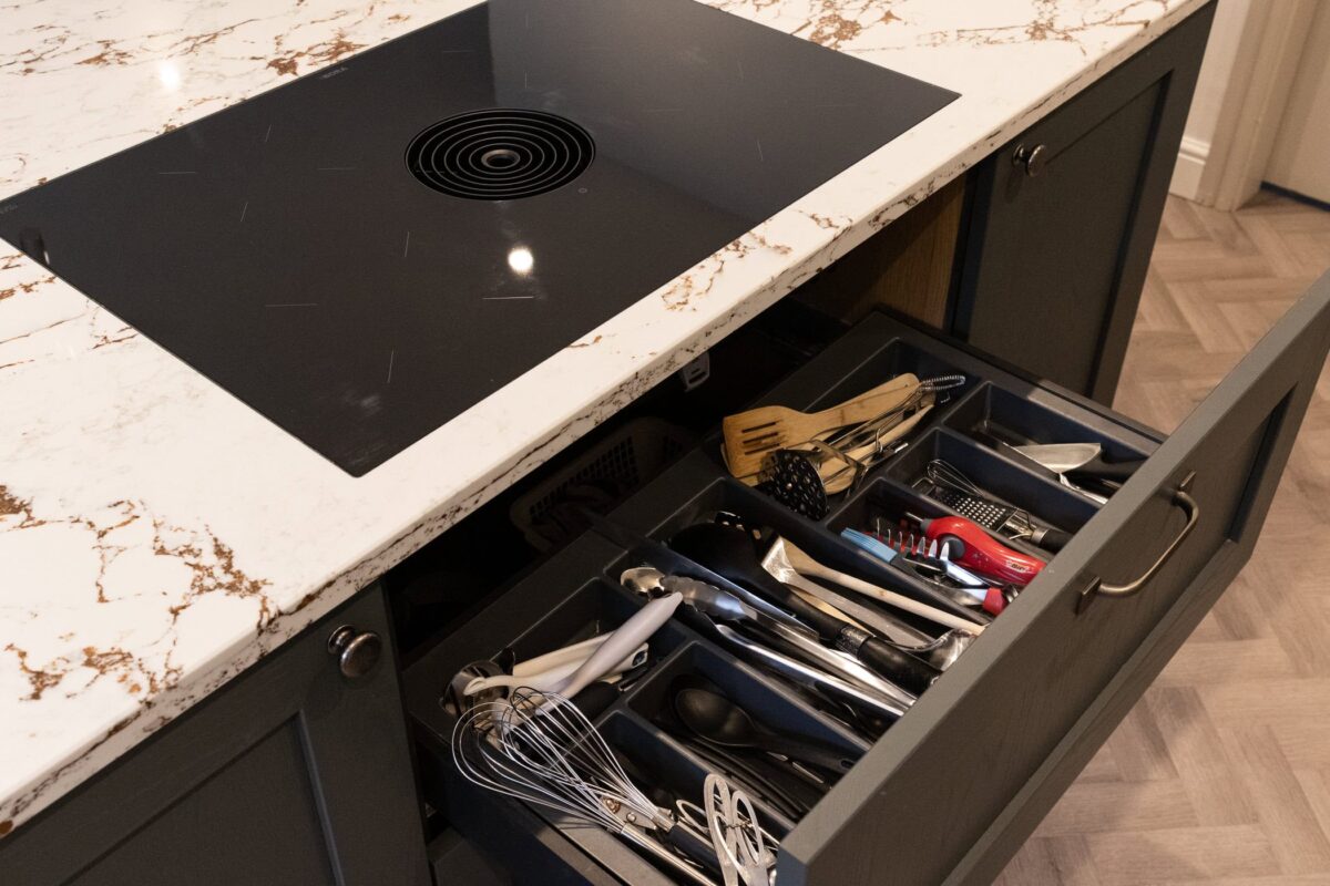 - Varied-Width Cutlery Storage: Two custom-sized drawer inserts (800mm and 1200mm) provide organised storage for different types of utensils: