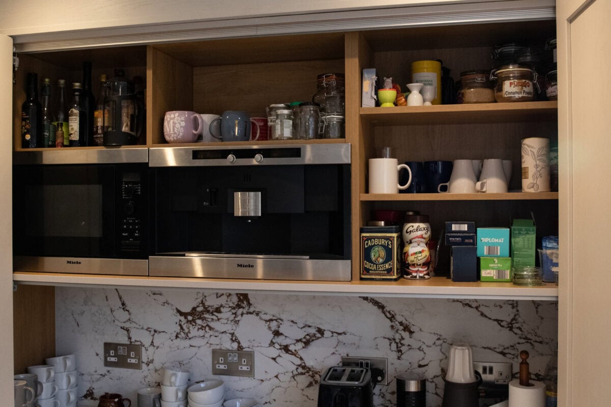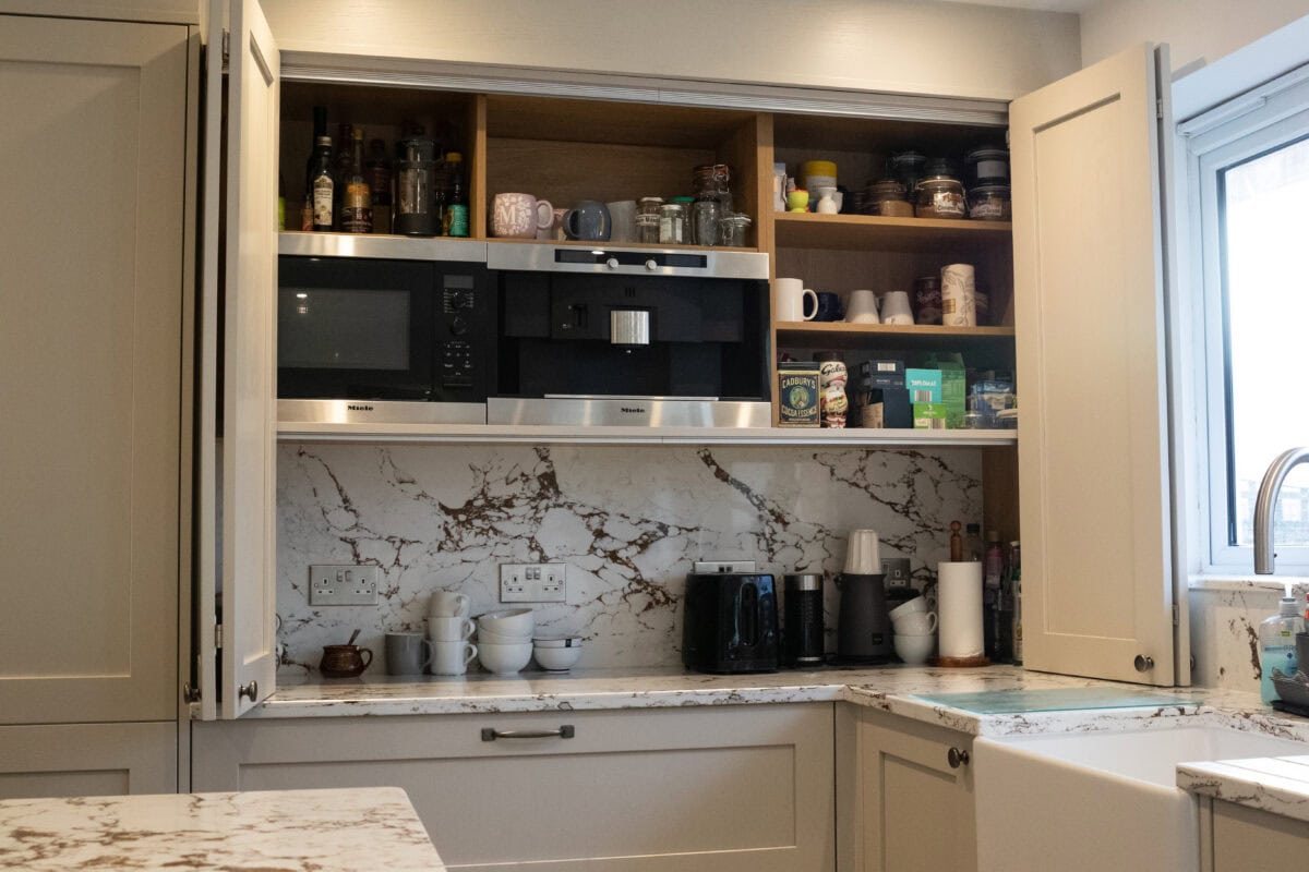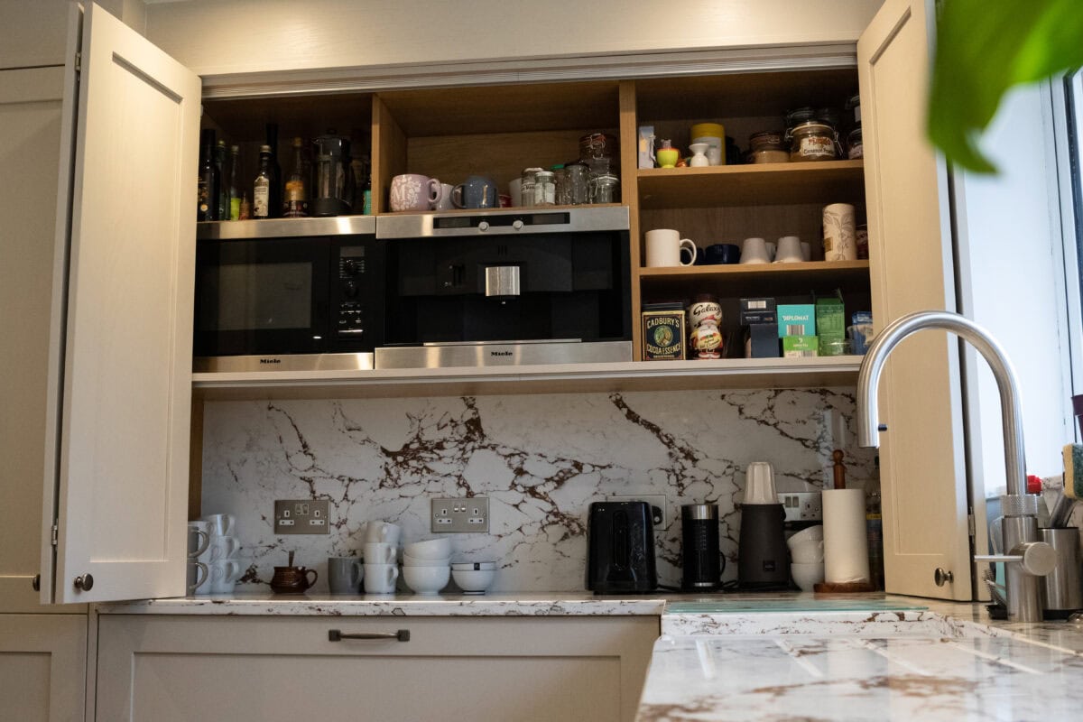 - The clients’ existing premium Miele appliances were thoughtfully incorporated into the design through a bespoke double bi-folding dresser that cleverly houses their coffee machine and microwave. This breakfast station can be neatly concealed when not in use, maintaining the kitchen’s clean lines.