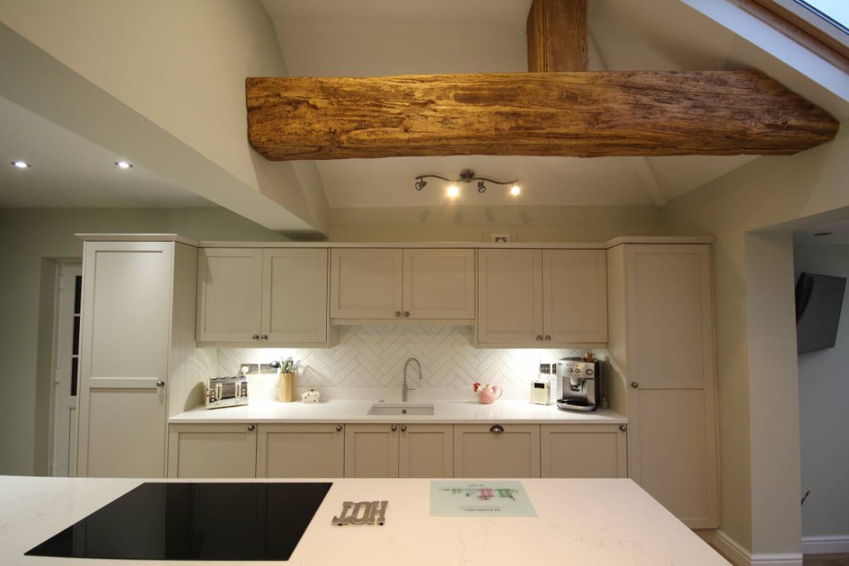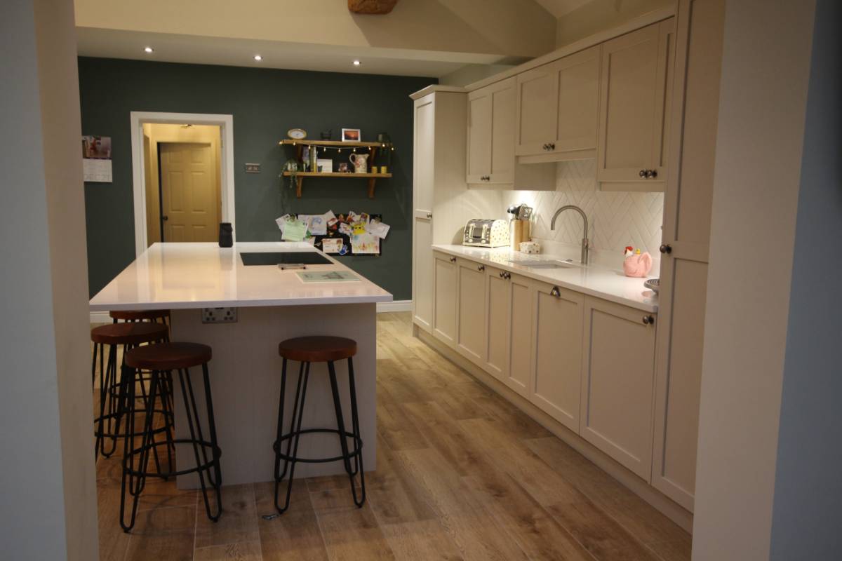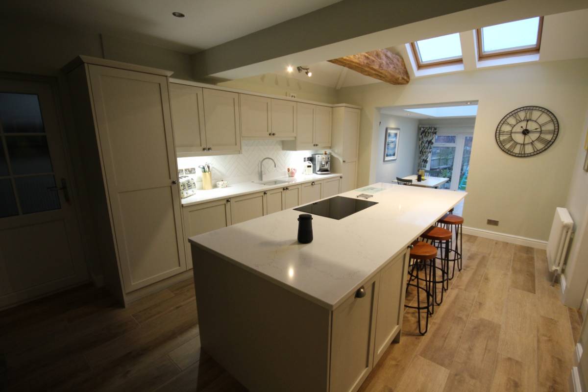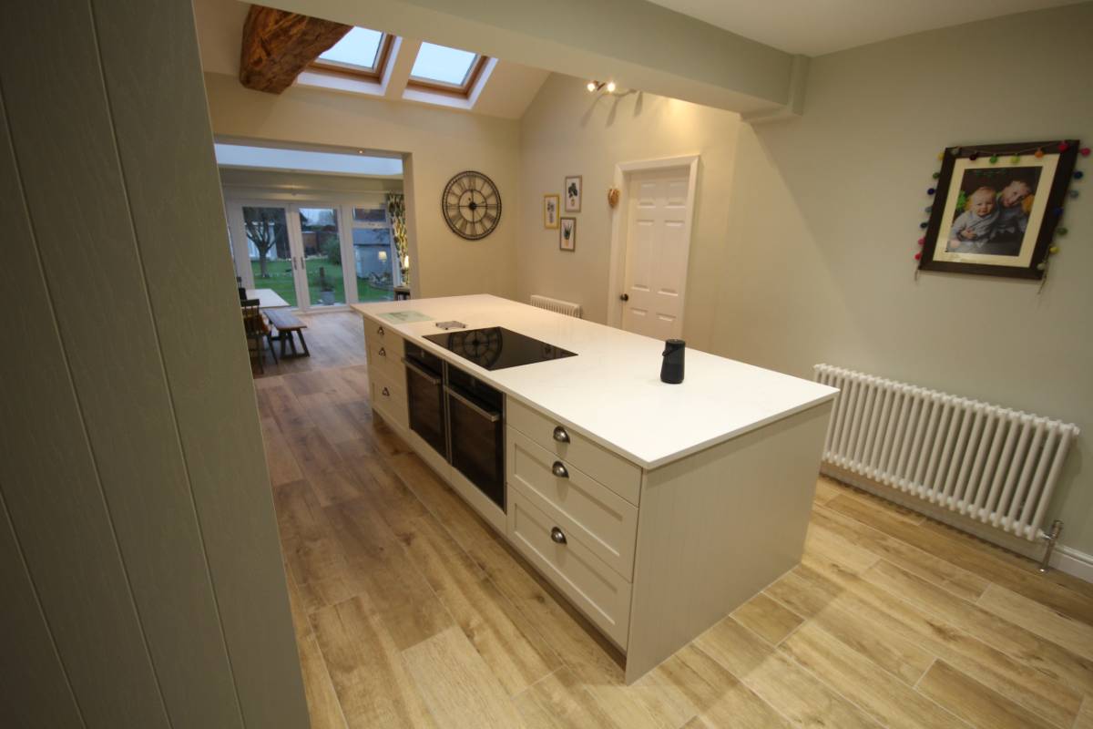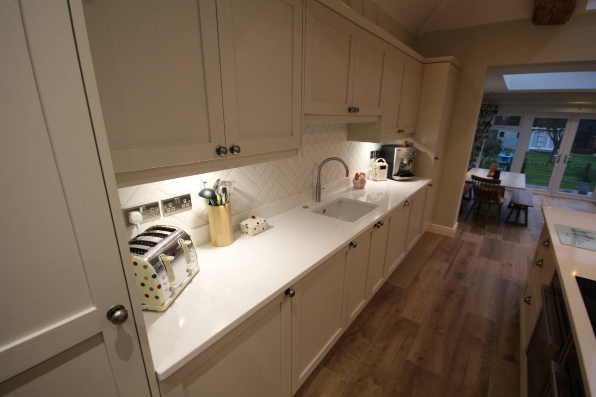 A Narrow Shaker Kitchen in Putty for a young family in Romsley. Our clients were having an extension on the back of their kitchen to create a semi-open plan kitchen/living area.