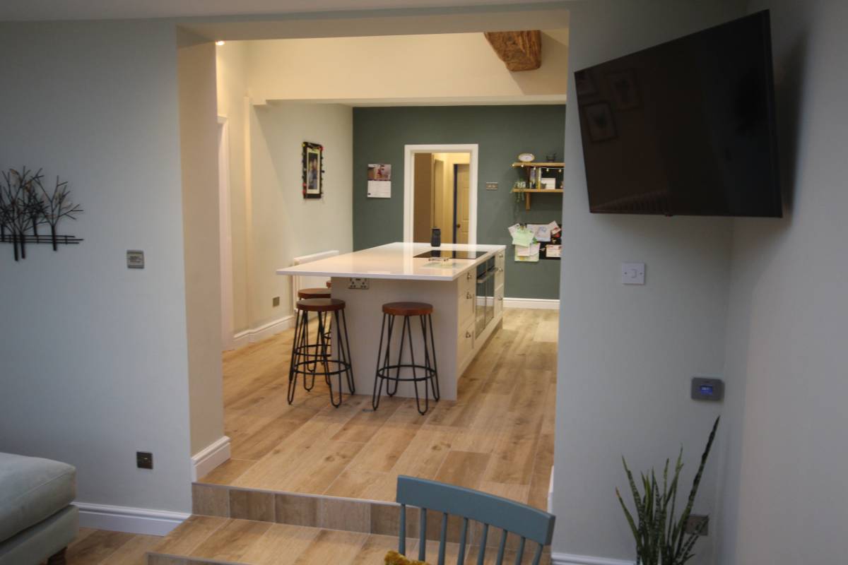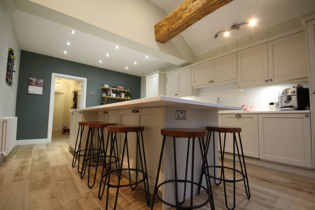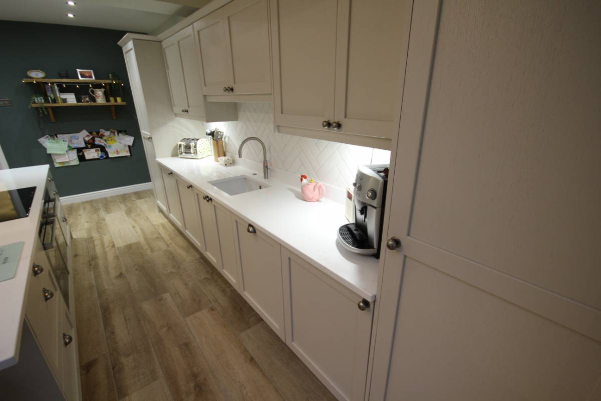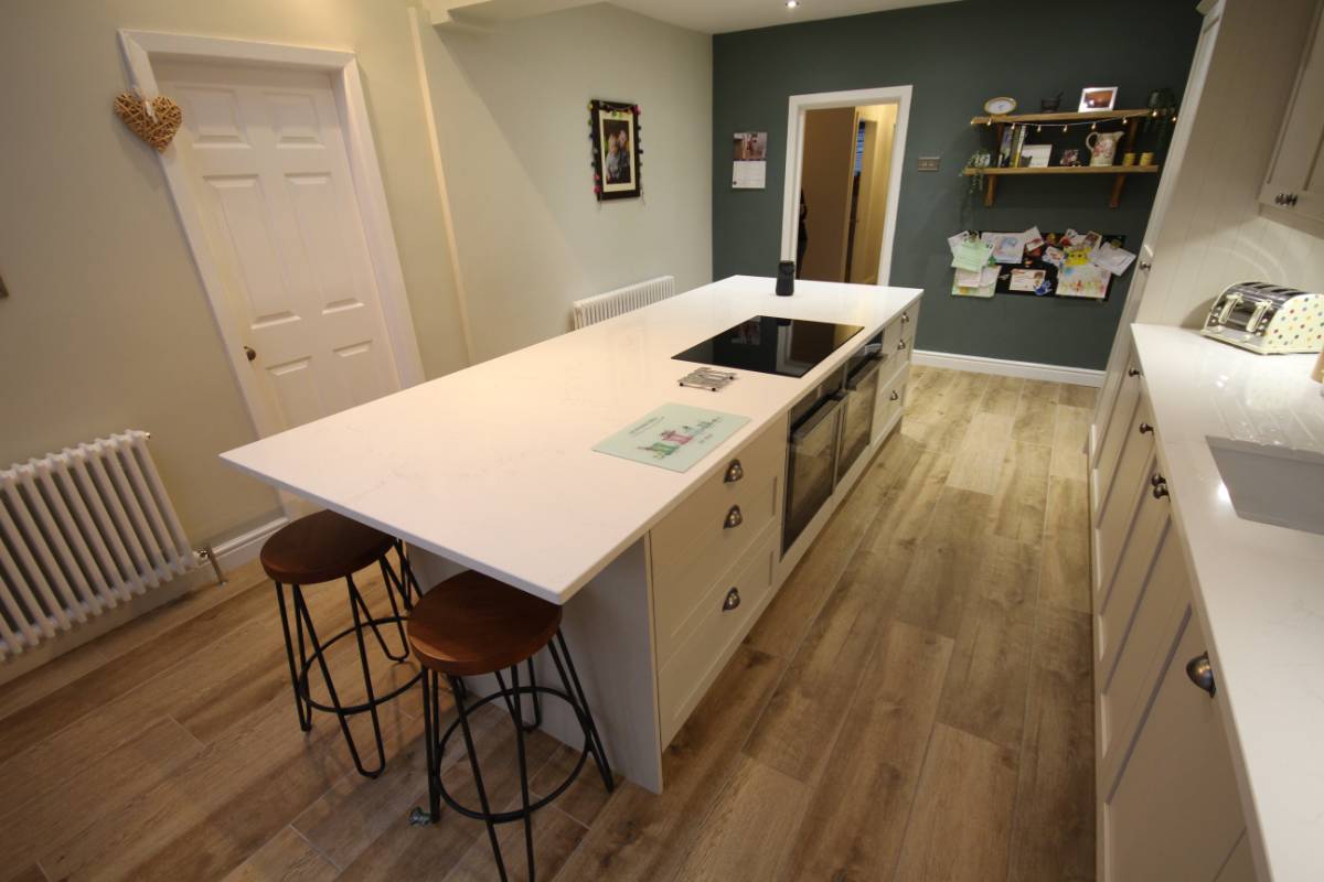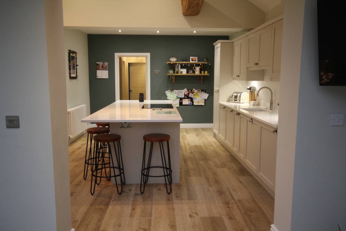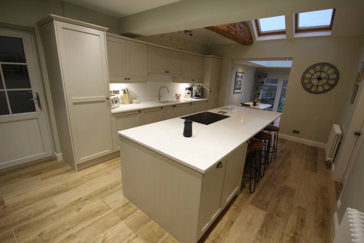 A Narrow Shaker Kitchen in Putty for a young family in Romsley. Our clients were having an extension on the back of their kitchen to create a semi-open plan kitchen/living area.
