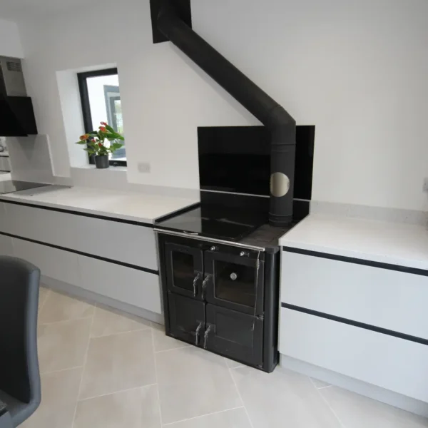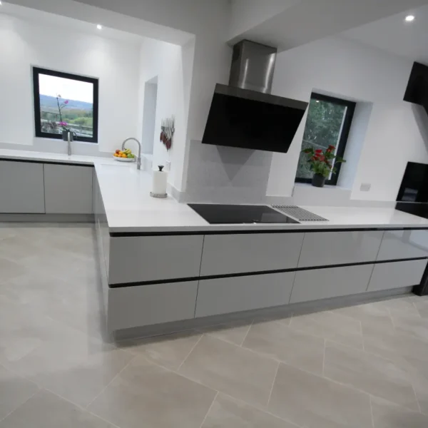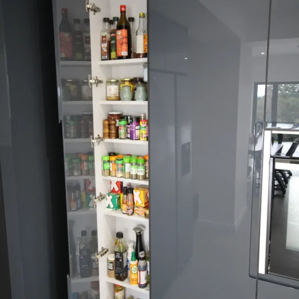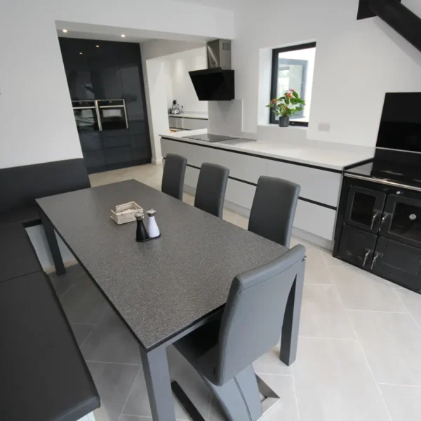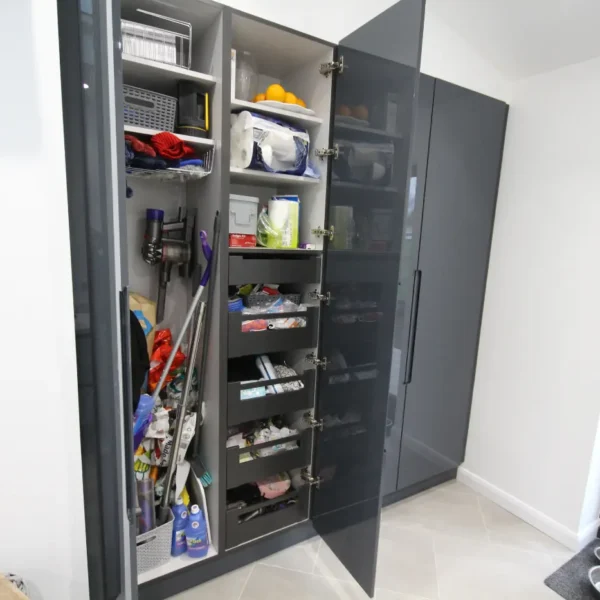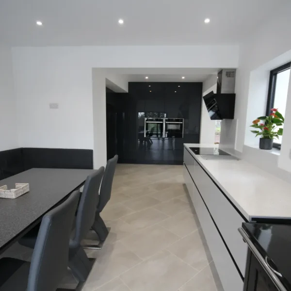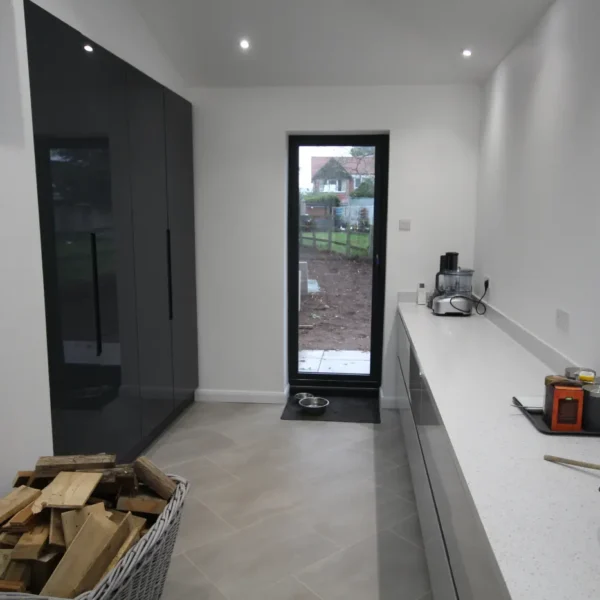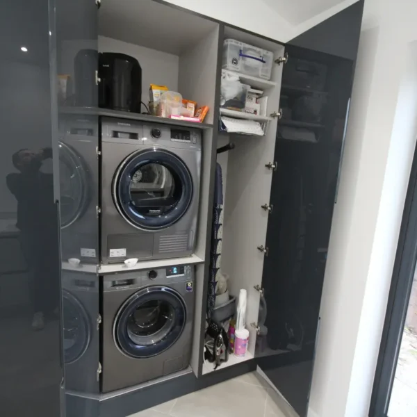 A sleek and stylish high gloss Parapan kitchen for clients in Bournheath. Our clients contacted us not really having an idea as to how they would like their kitchen set out. They wanted a sleek, tidy, flowing kitchen to include a utility area.