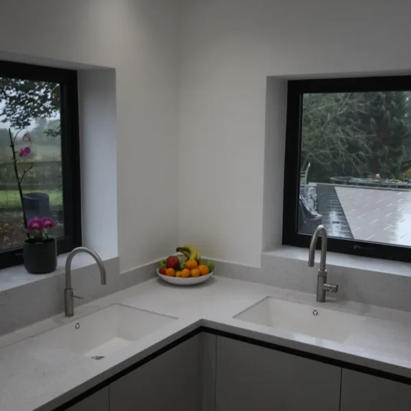 - Corian worktops in silver birch with 2x glacier white sinks, drainer grooves, coved upstand and window sills