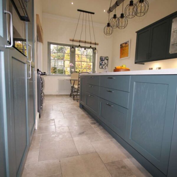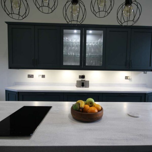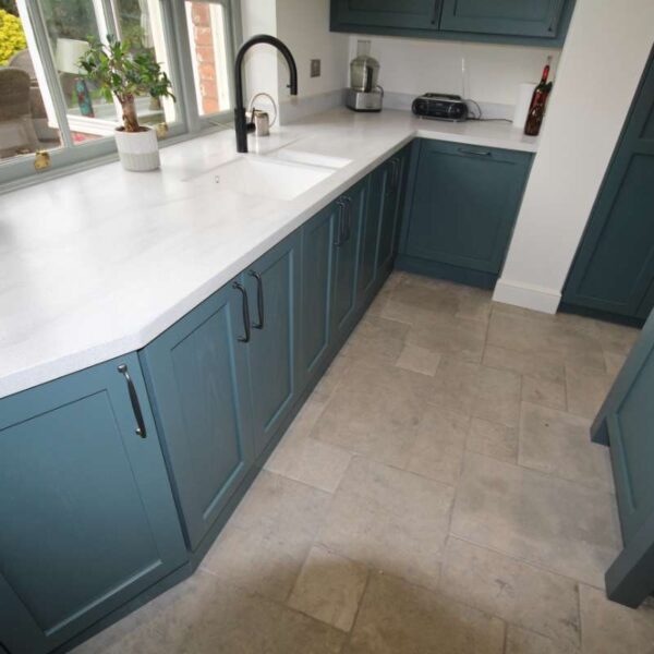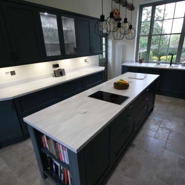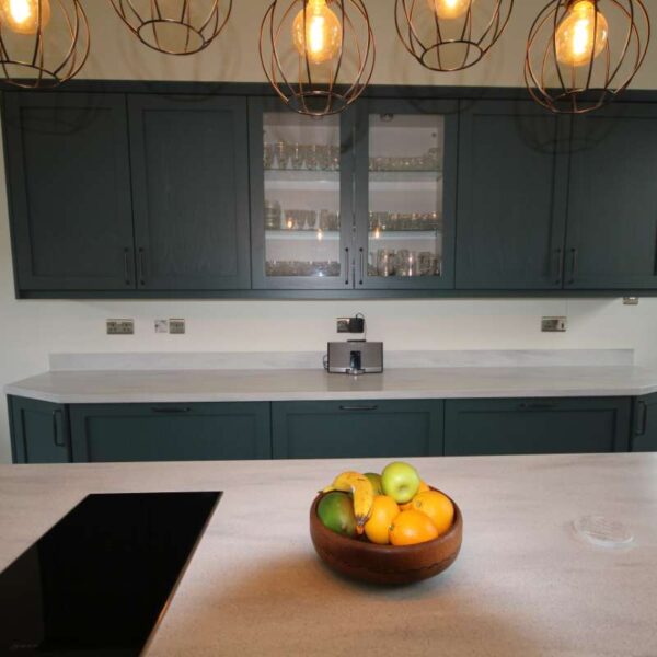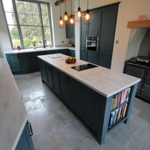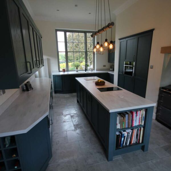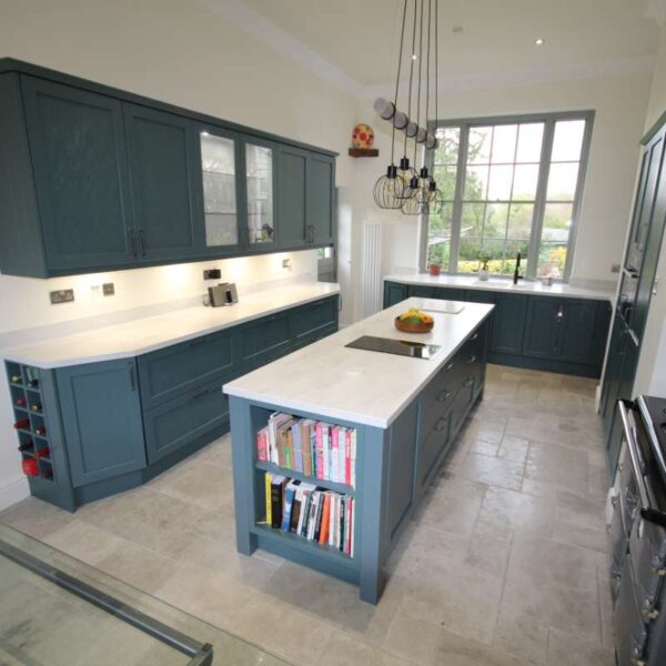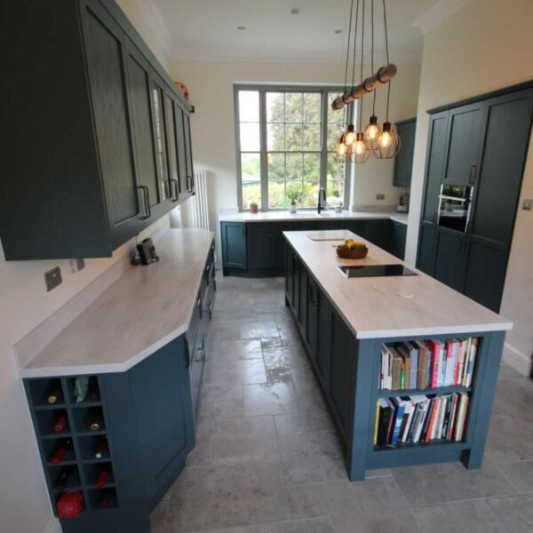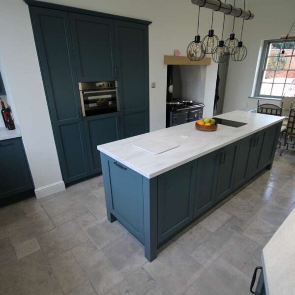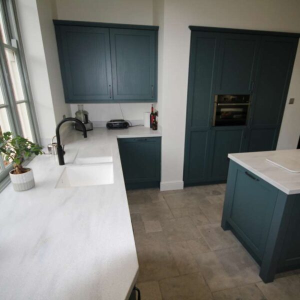 A striking shaker kitchen painted to order in Baltic green with light grey cabinetry. Our clients in Salwarpe, near Droitwich lived in a beautiful Grade II listed period property. Having recently bought the property, the only thing letting the house down was the rather shabby, outdated kitchen that didn’t fit with the rest of the property.