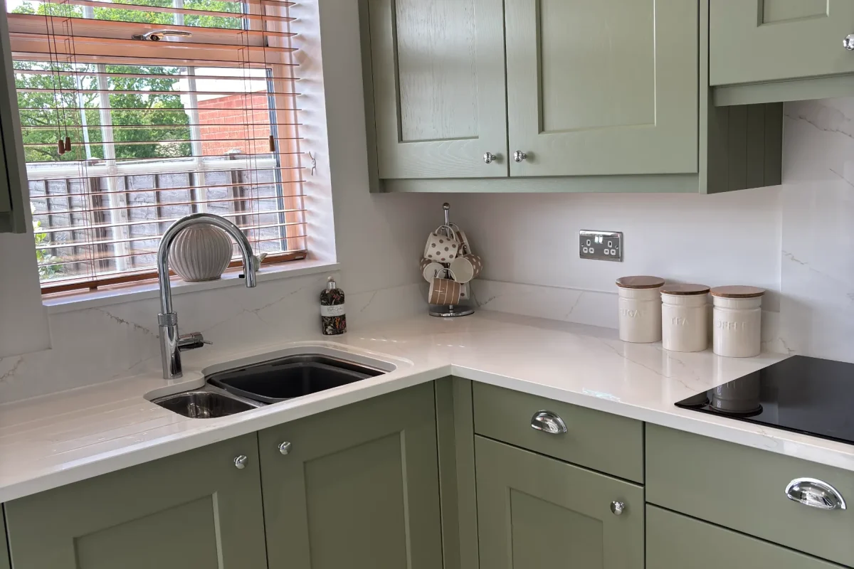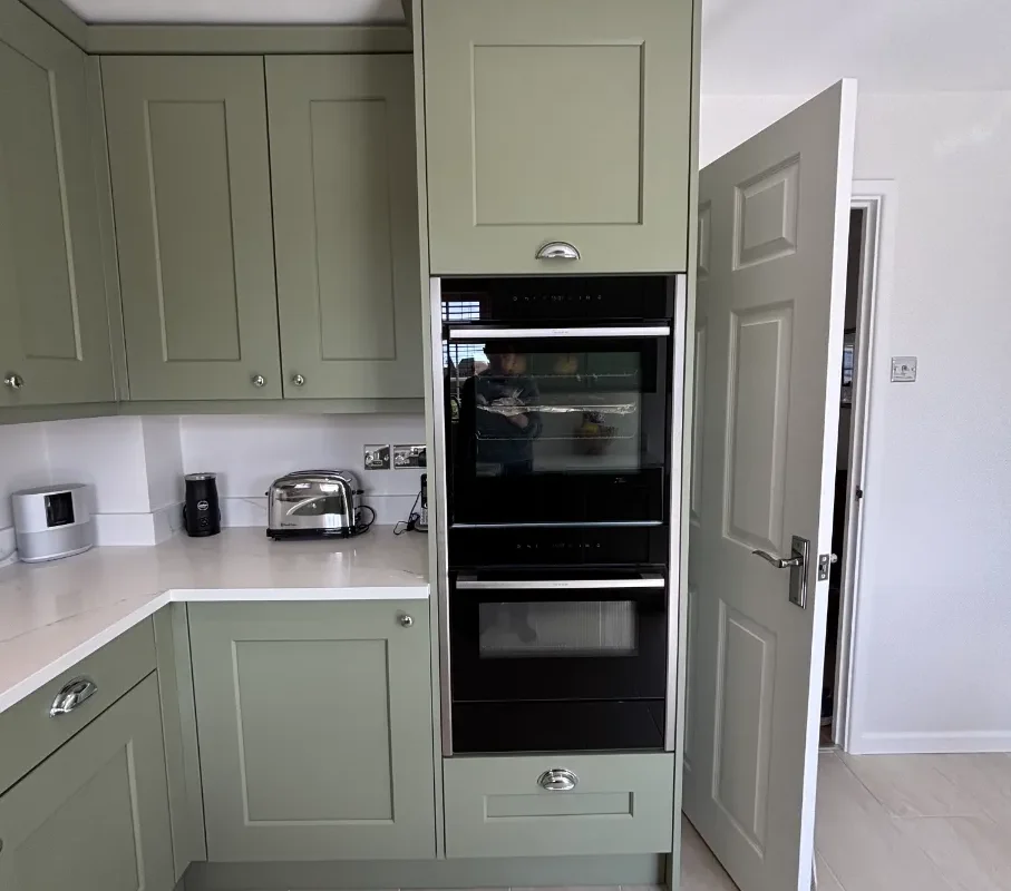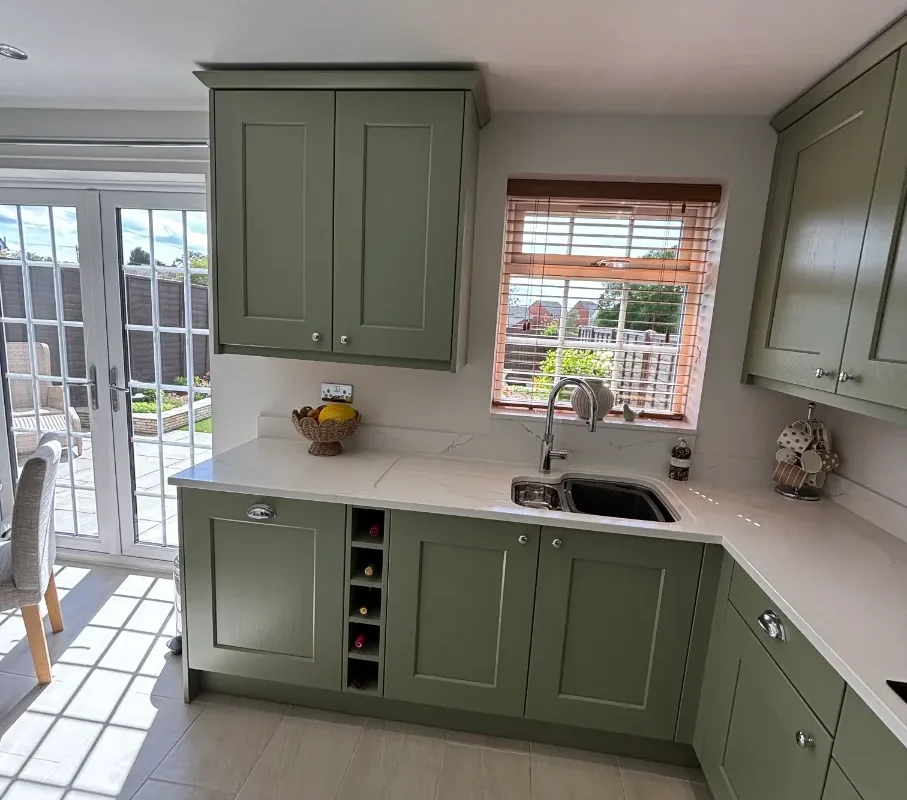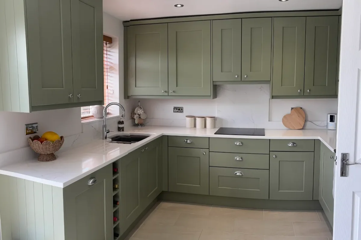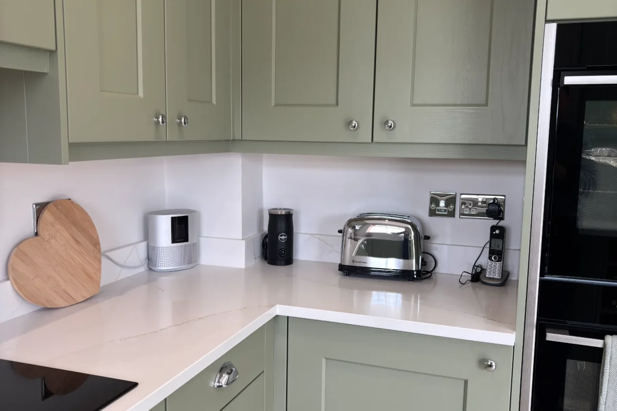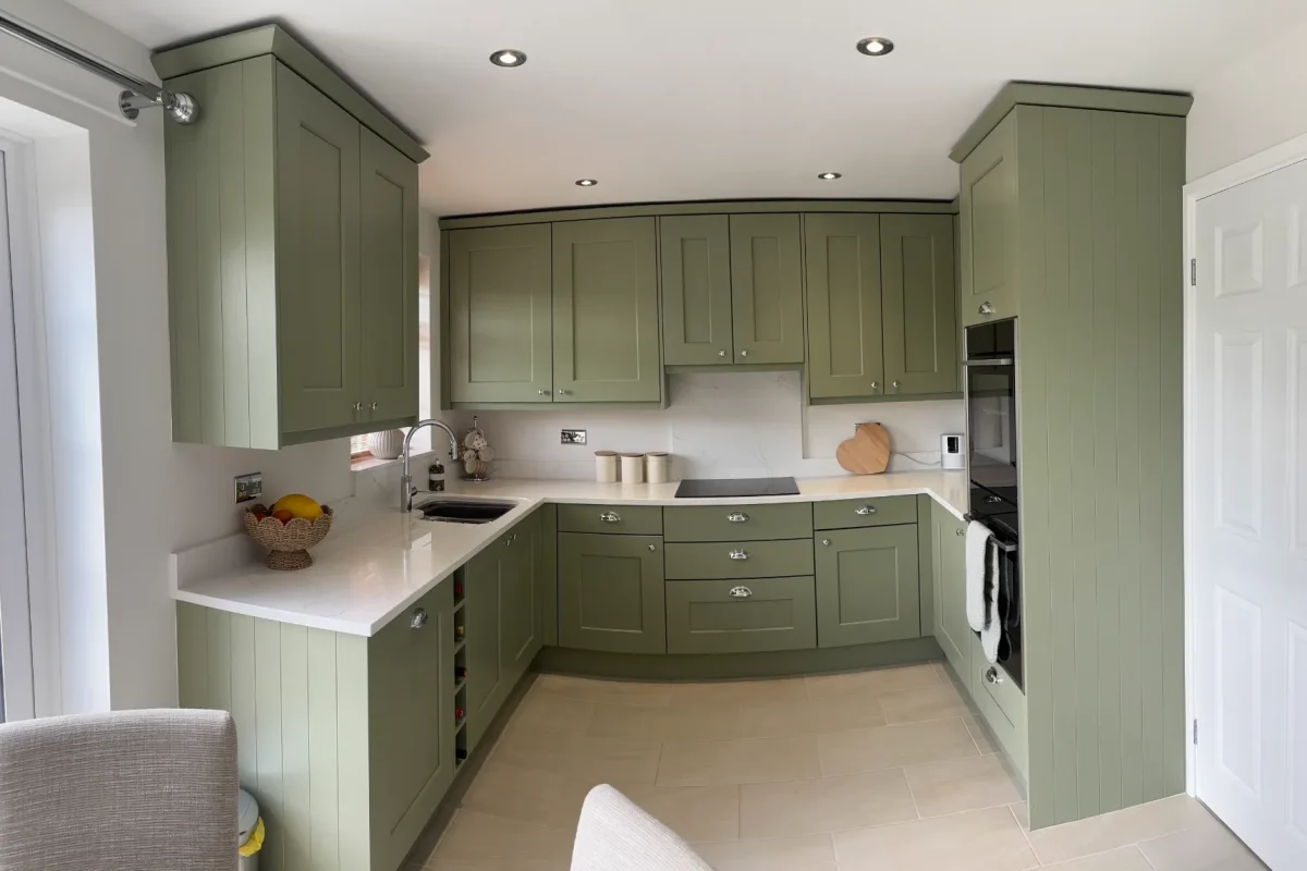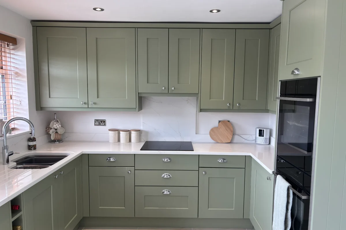 The heart of this kitchen? Those Wide Shaker Doors in Farrow & Ball’s Lichen. It’s this lovely heritage green that shifts with the light – soft sage in the morning, then deeper and more grounding as evening comes. We’ve matched it with Sarano Oak 1334 cabinet finish for natural warmth. It’s a palette that works beautifully whether you’ve got stone floors or modern timber.