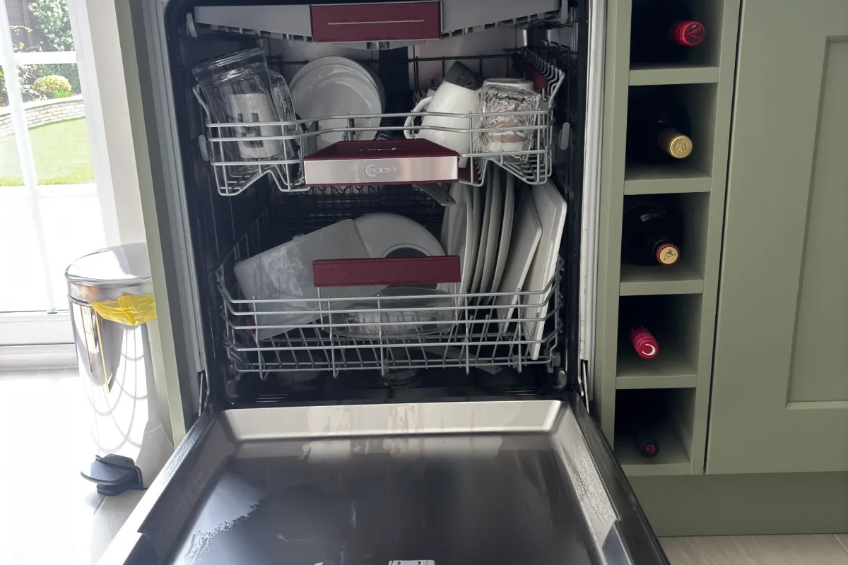 For extraction, we’ve chosen the Miro TEMPO 275730. It’s striking, minimal, powerful yet quiet. Fully integrated ducting handles efficiency. Cold storage gets the same attention – the Neff N50 Built-Under Fridge (KU1212FE0G) keeps produce crisp and organised. The Neff N50 Dishwasher (S195HCX26G) runs whisper-quiet with flexible wash programmes.