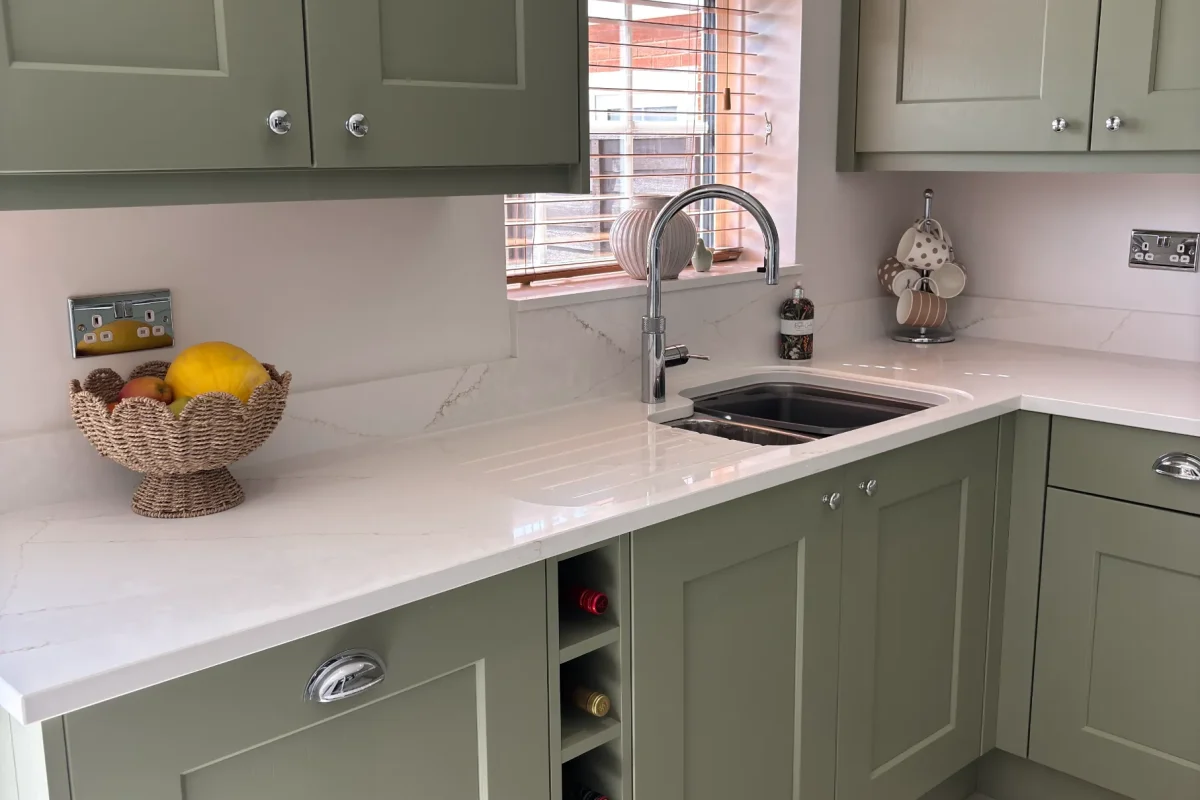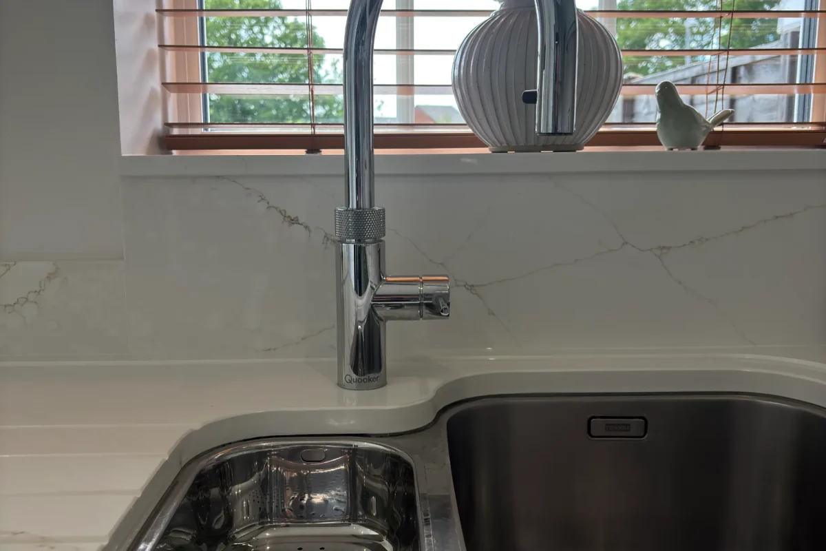 Details matter here. The chamfered edge profile adds definition. Precision cut-outs for sink, hob, and tap ensure perfect fit. Recessed drainer grooves keep the workspace practical without sacrificing elegance. Matching upstands, splashback, window sill, and riser complete the look, wrapping the room in continuous material flow. We included an additional recessed drain to boost day-to-day usability.