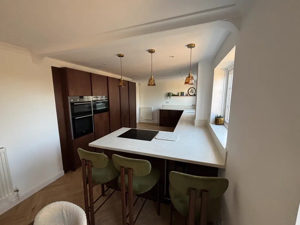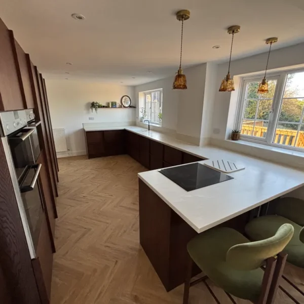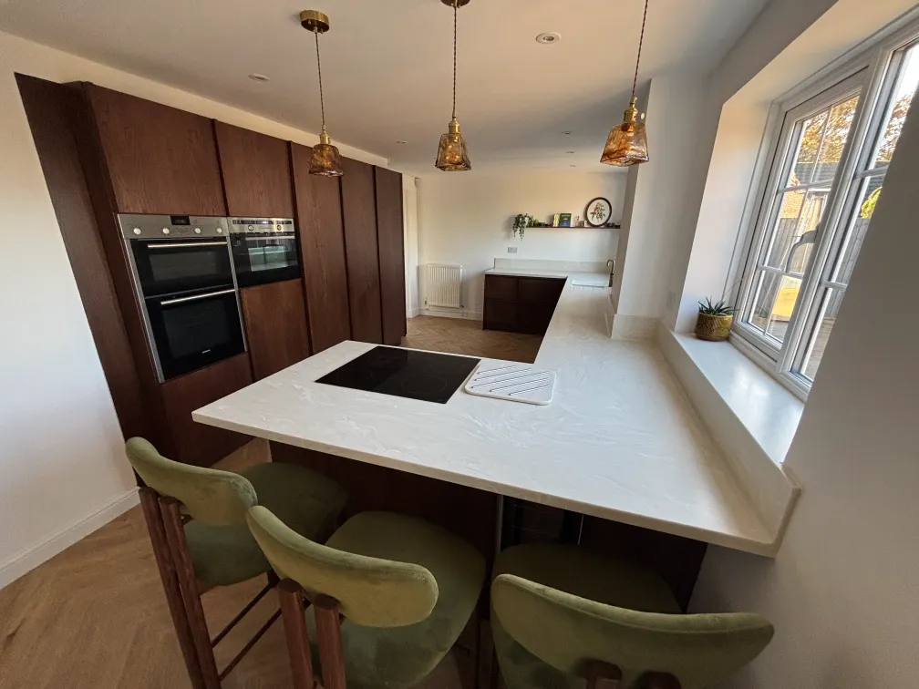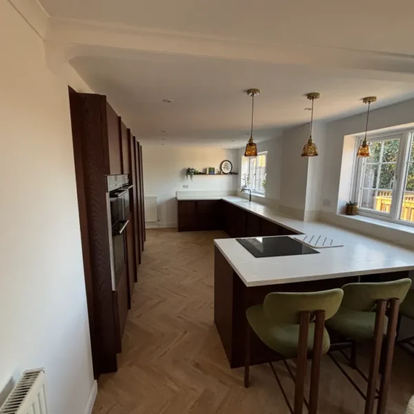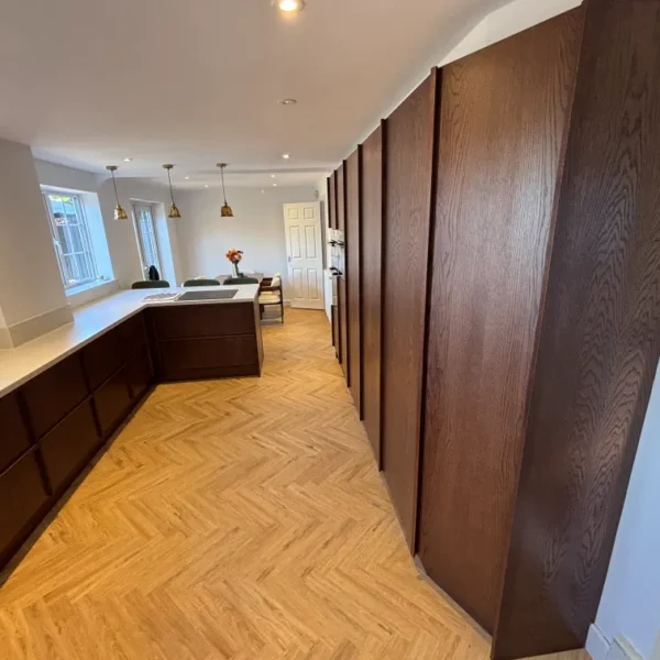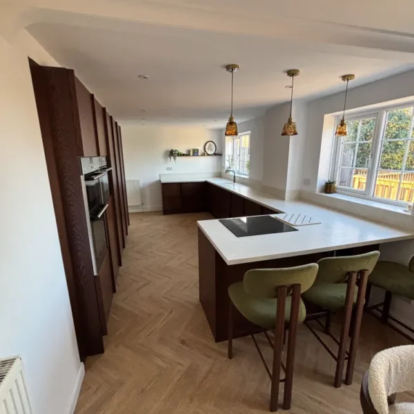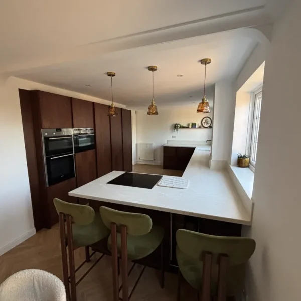 This Redditch project is a great example of how considered materials and precise craftsmanship can transform a large open-plan space into something both striking and welcoming. Our brief was to create a kitchen that felt architectural and refined, yet warm enough to be lived in every day – a space that would age gracefully rather than chase short-lived trends.
