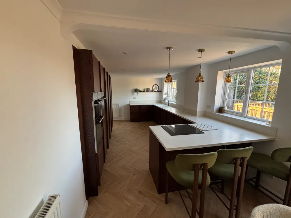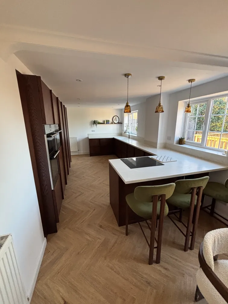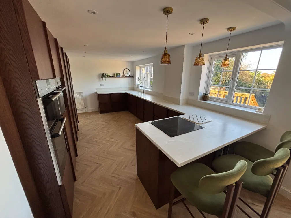 The completed kitchen feels confident, calm, and deeply considered. Natural light plays across the oak surfaces throughout the day, while the pale worktops lift the space and keep it feeling open.