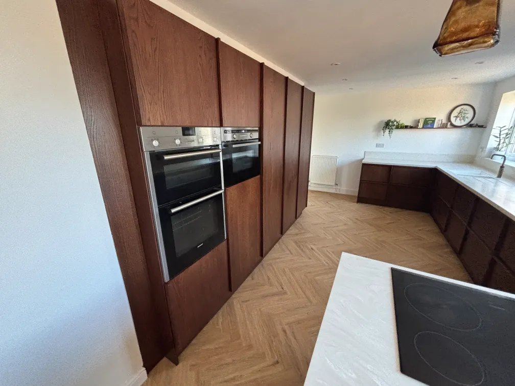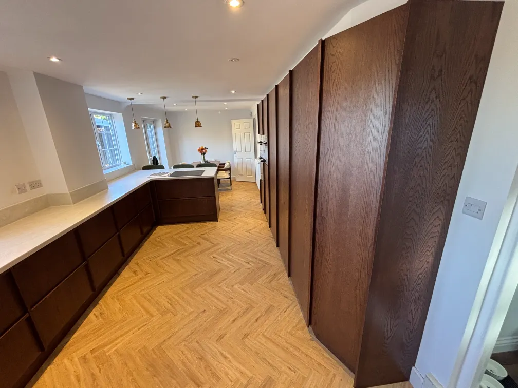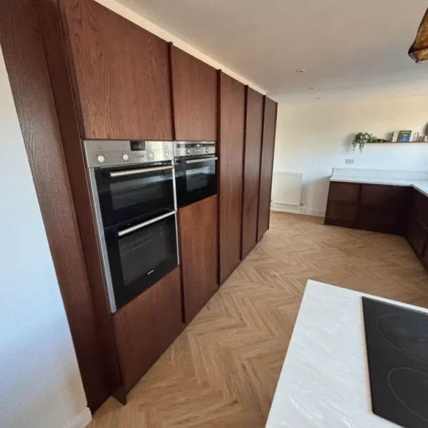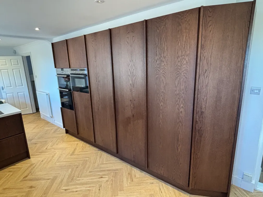 - Oak veneer slab doors in a rich dark oak finish, offering a clean, contemporary look while retaining the warmth of real timber