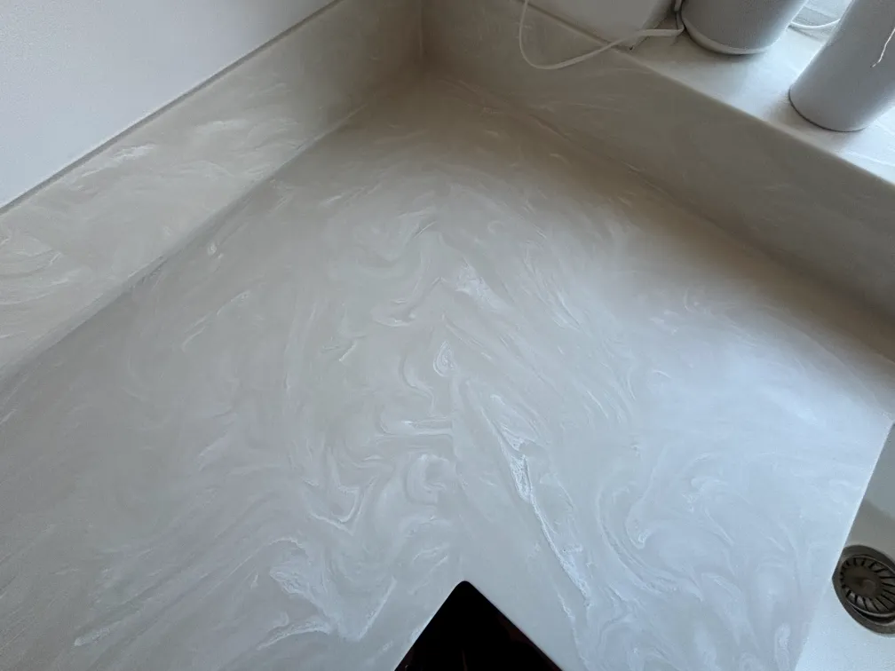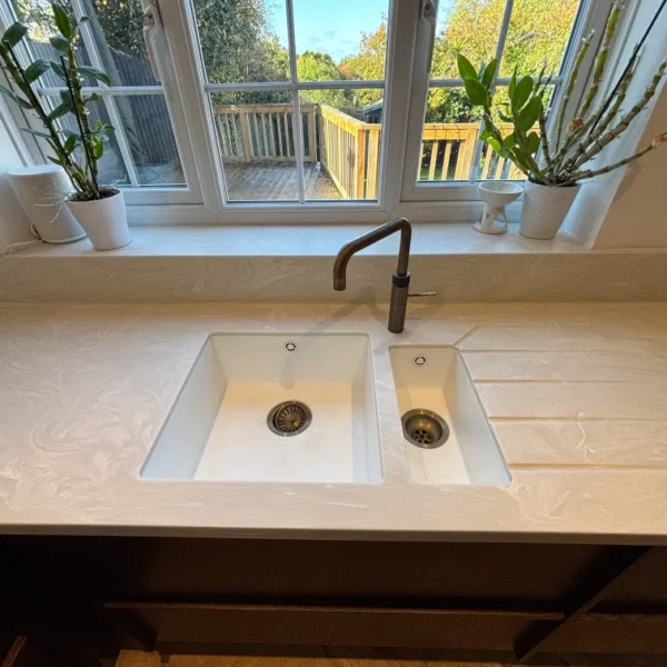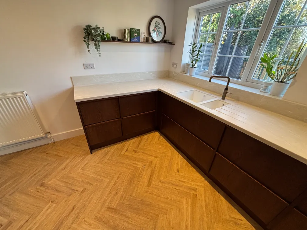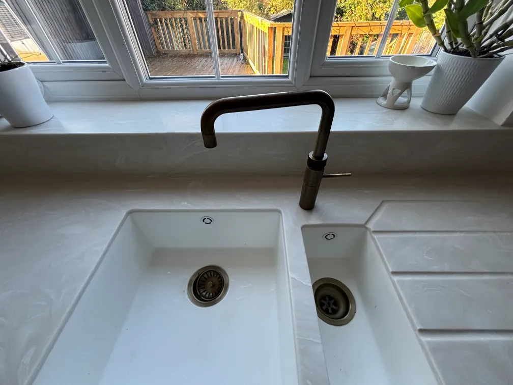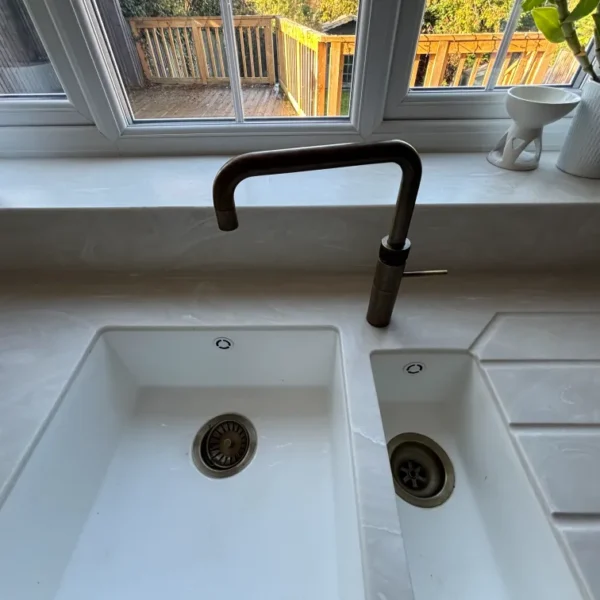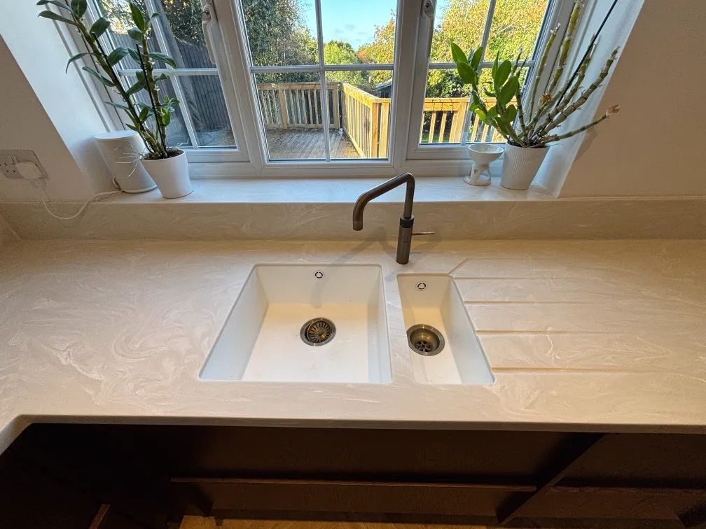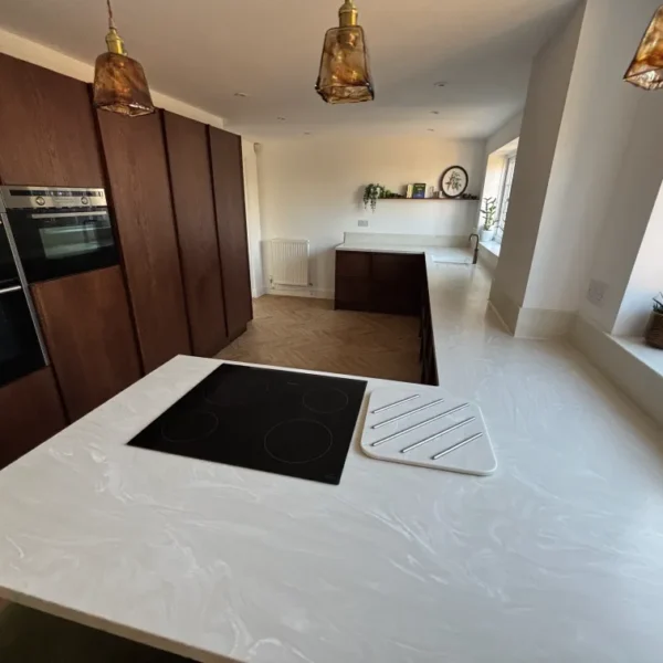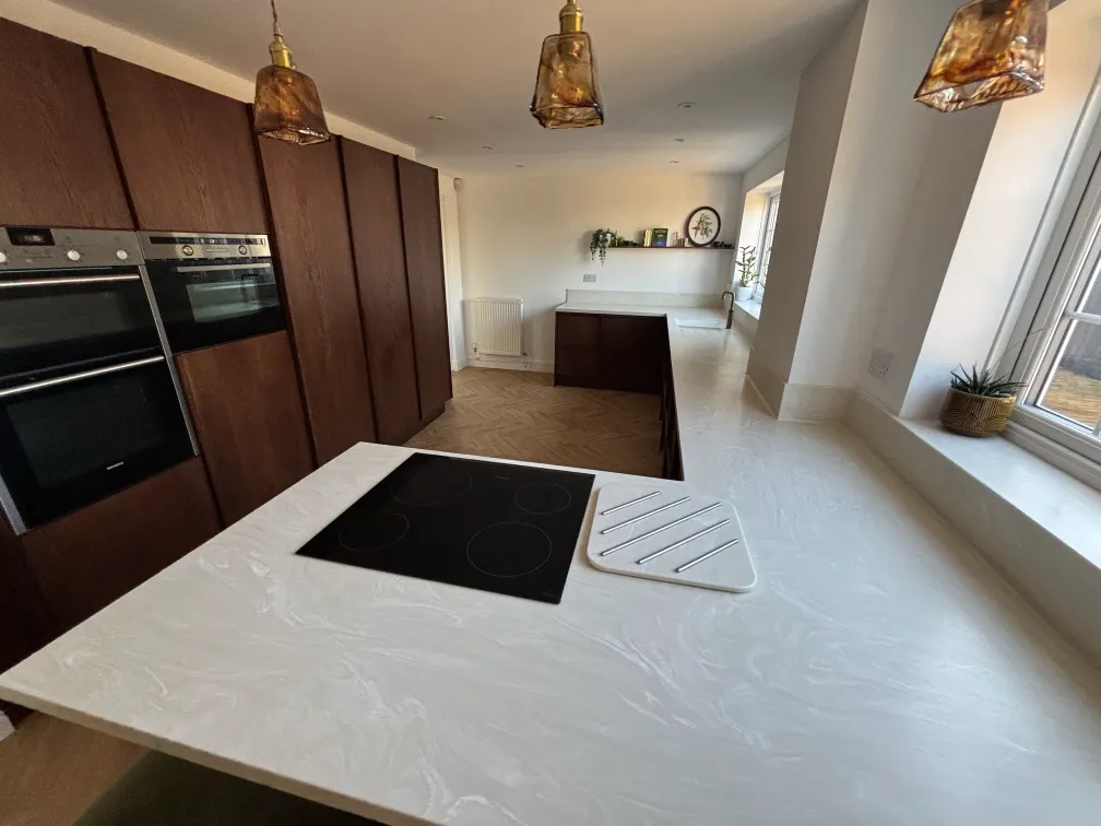 - Integrated Corian sinks, coved upstands, and window sills, creating a continuous, hygienic surface that flows effortlessly through the room