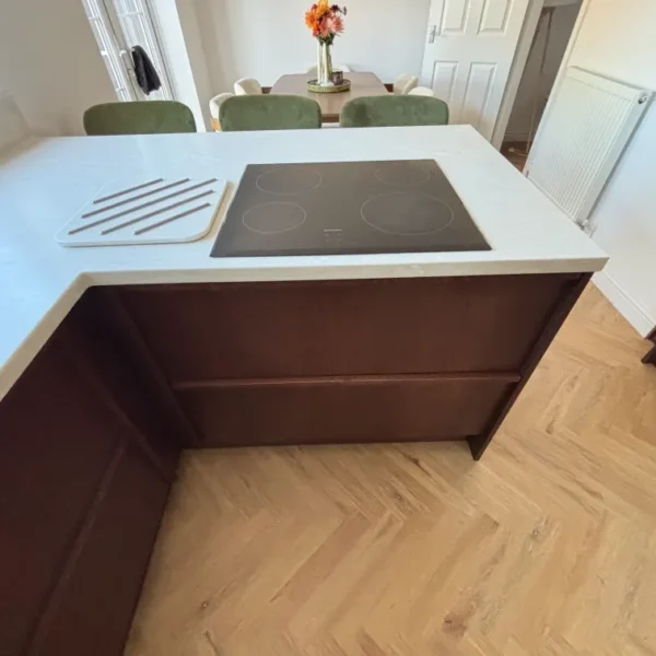 The island also required precise detailing, with clean waterfall edges and neatly integrated appliances. Careful coordination between cabinetry and worktop fabrication ensured every junction was crisp, seamless, and visually balanced.