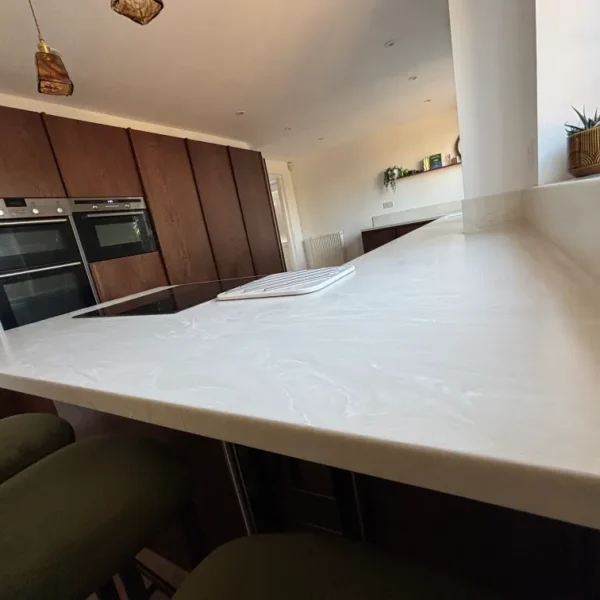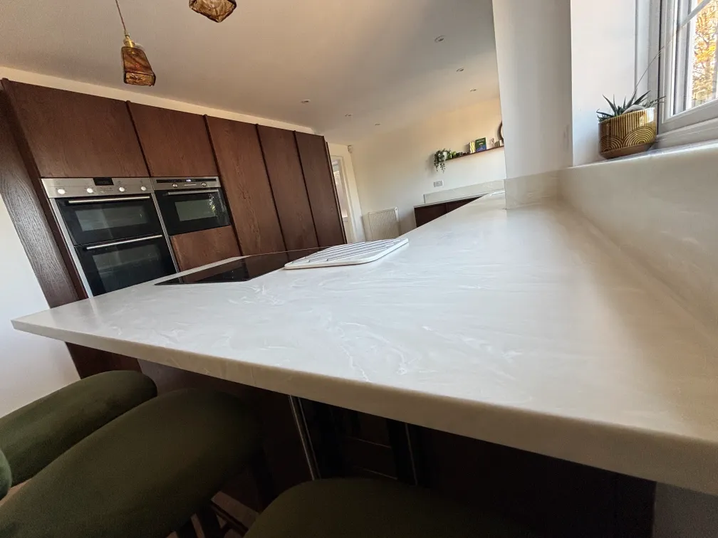 - Corian Nimbus Prima worktops, selected for their soft veining, durability, and seamless finish