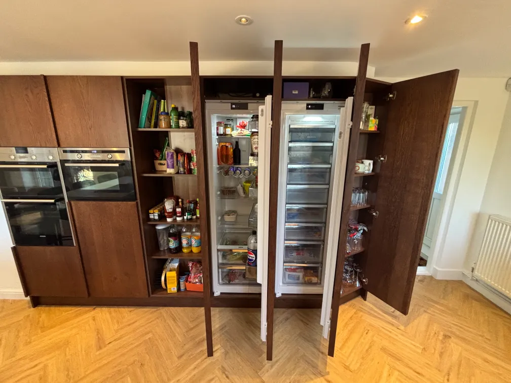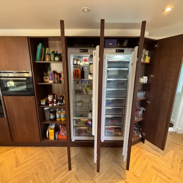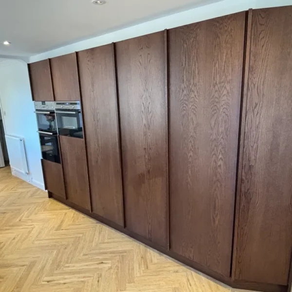 One of the main challenges was ensuring the tall cabinetry felt intentional rather than overpowering. By carefully proportioning the doors and aligning grain direction across units, the run feels calm and architectural rather than heavy.