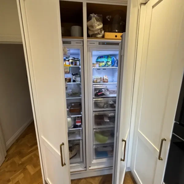 - Integrated fridge and freezer behind full-height cabinetry