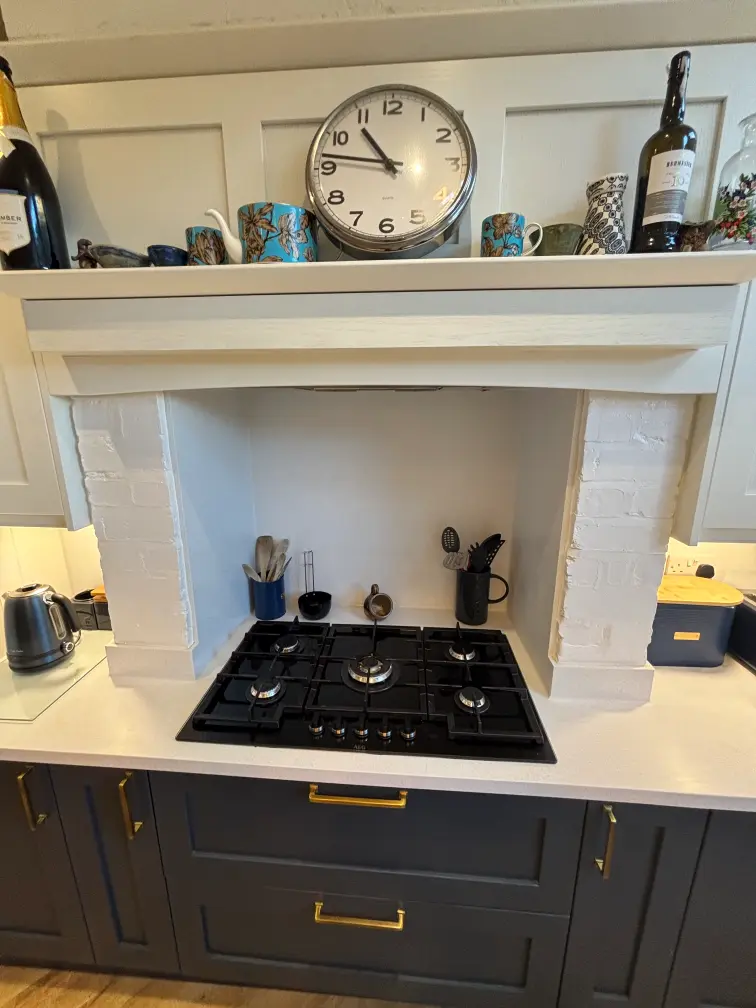 - A full-height hob splashback within the chimney breast