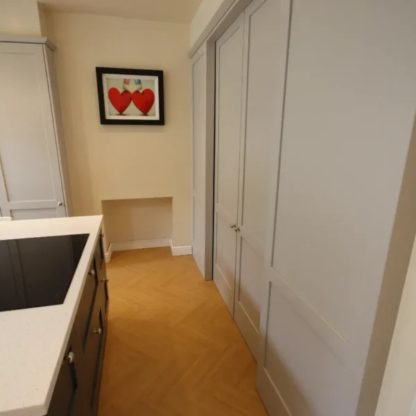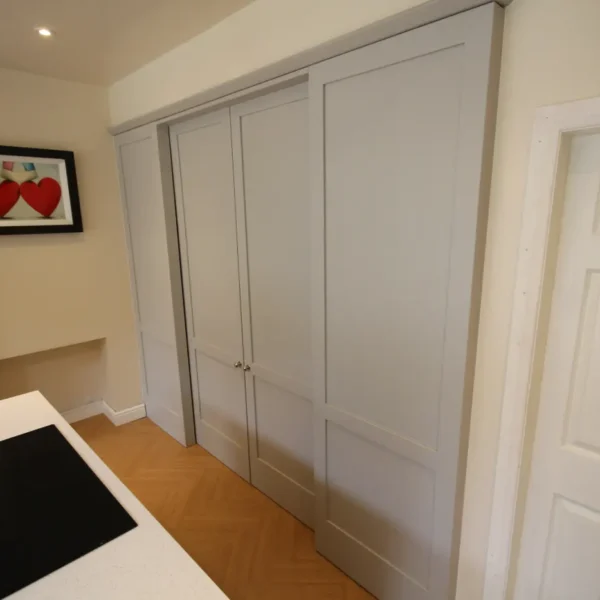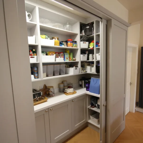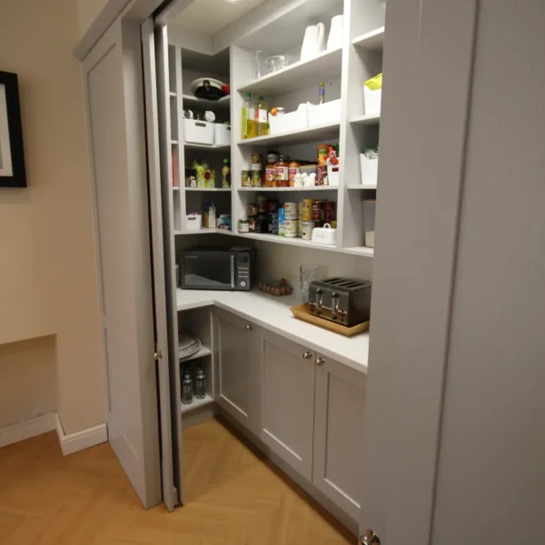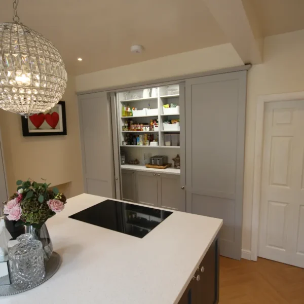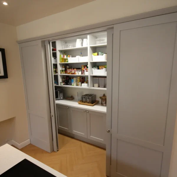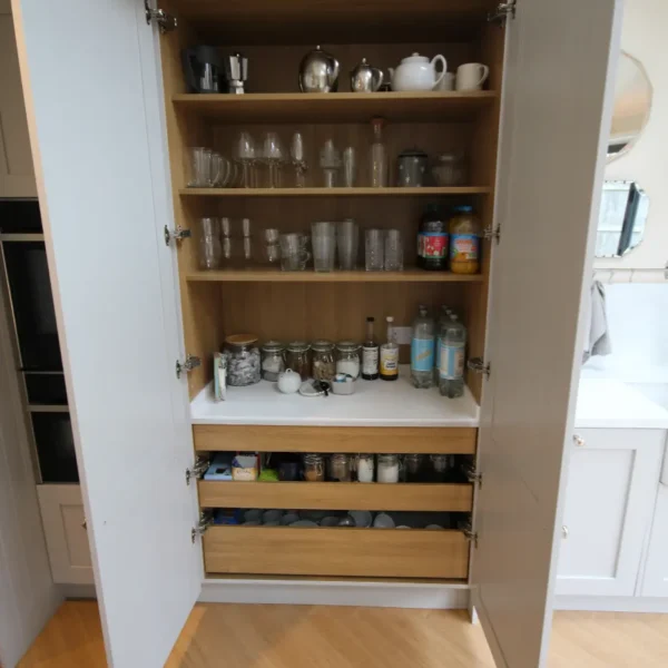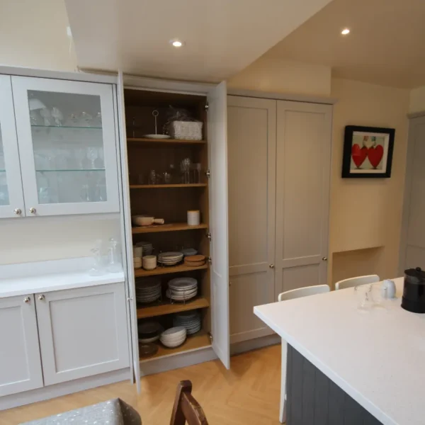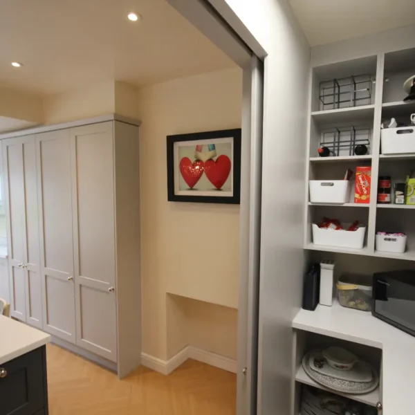 To the rear of the kitchen, built into an alcove, our design included a pantry with open shelving housed behind sliding doors. The pantry also included worktop space for their microwave and toaster.