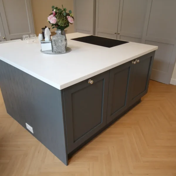 A large island unit in dark grey, incorporated the induction hob, seating for two, pull out bins and plenty of additional storage space.