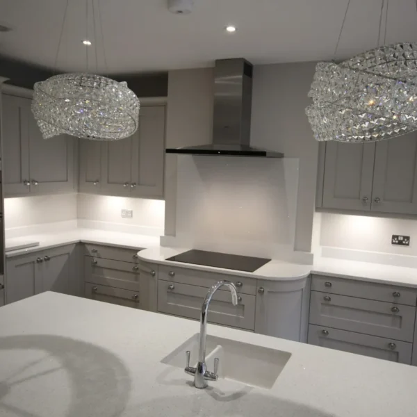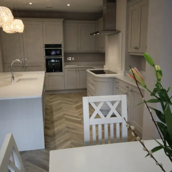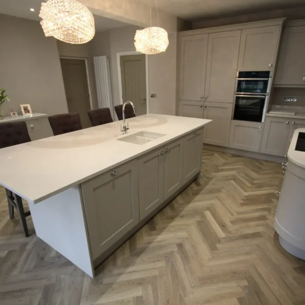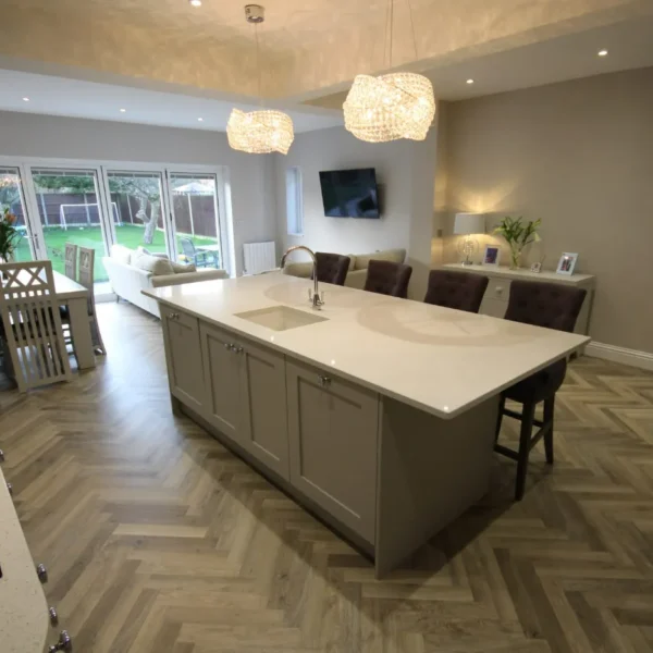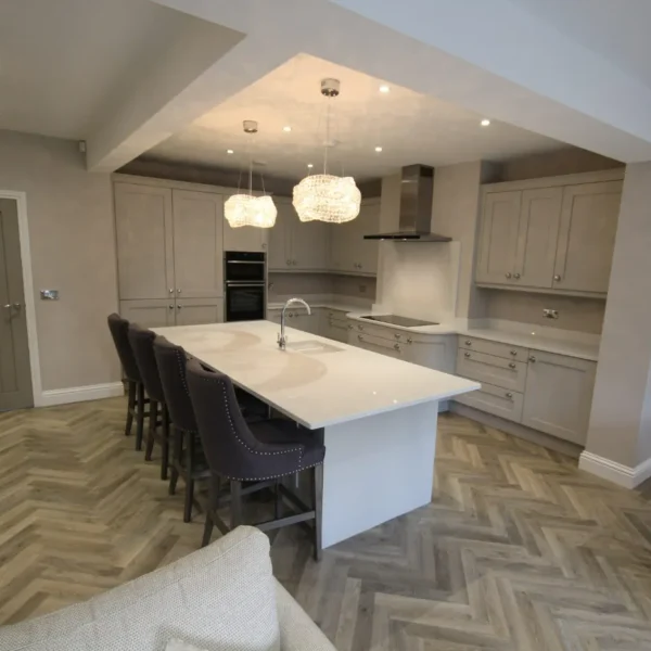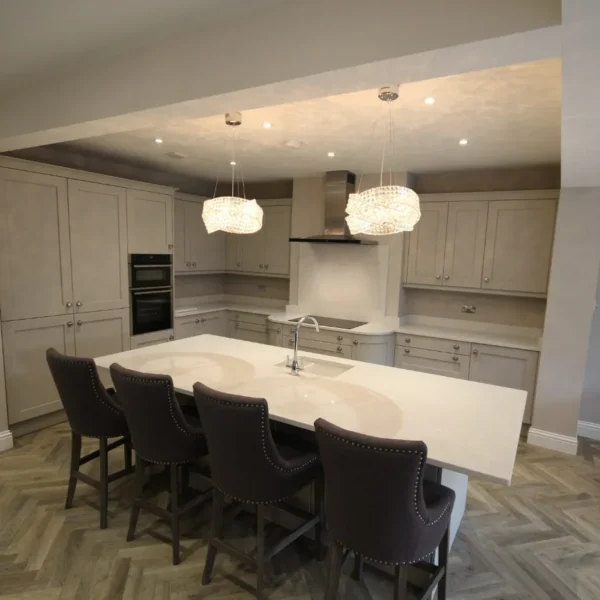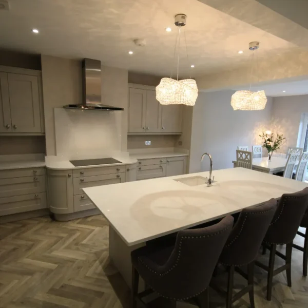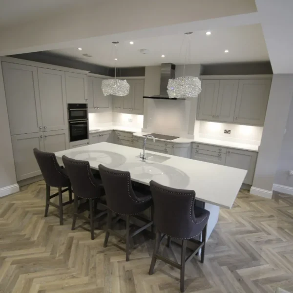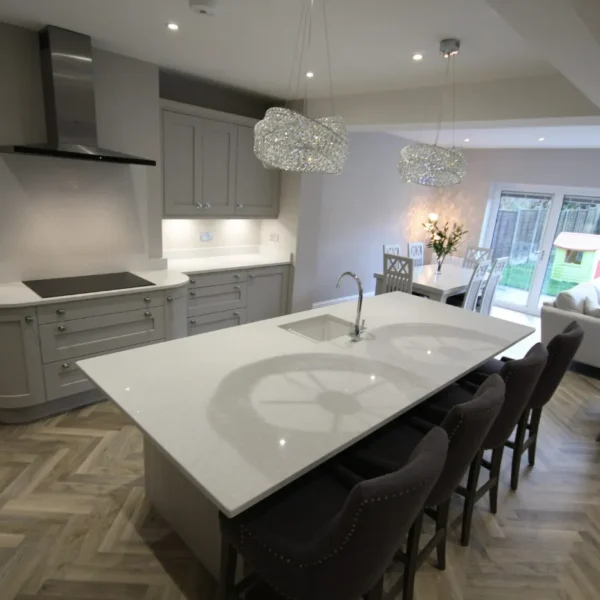 Our clients had a young family and wanted a space where they could all spend time together. They chose shaker doors in soft grey with snowflake mirror look quartz worktops, giving a classic yet modern feel to the kitchen.