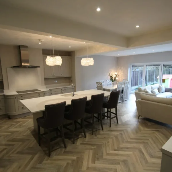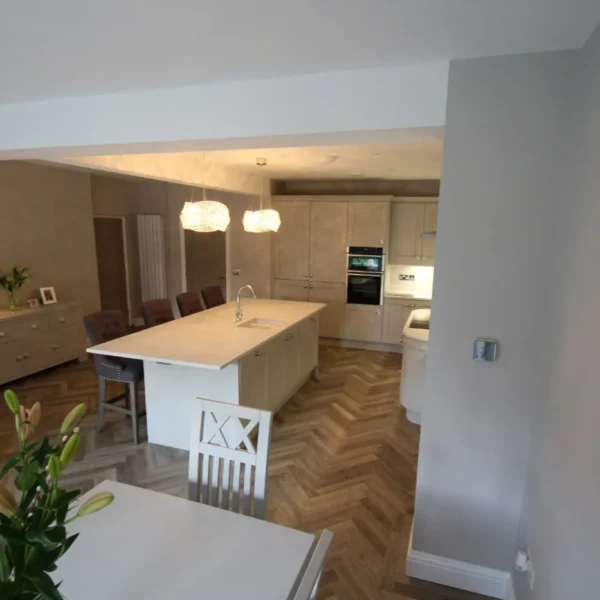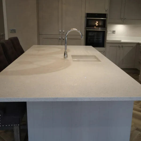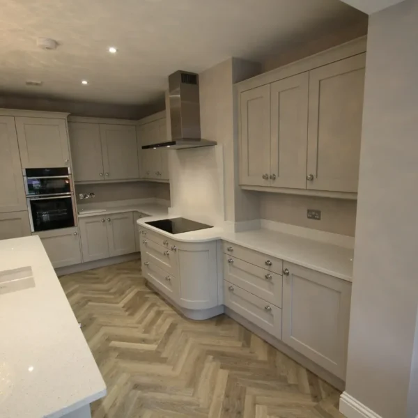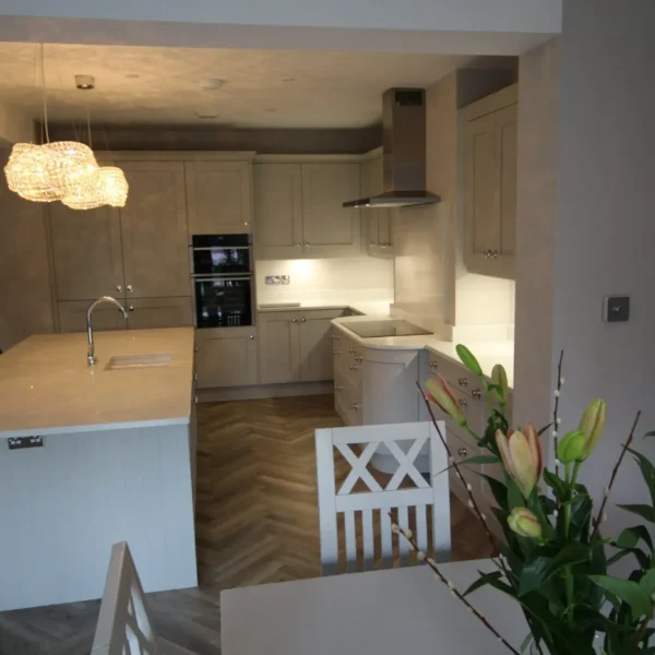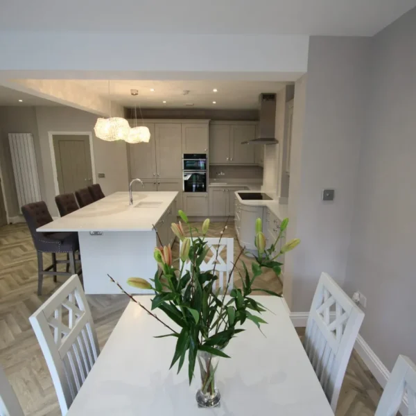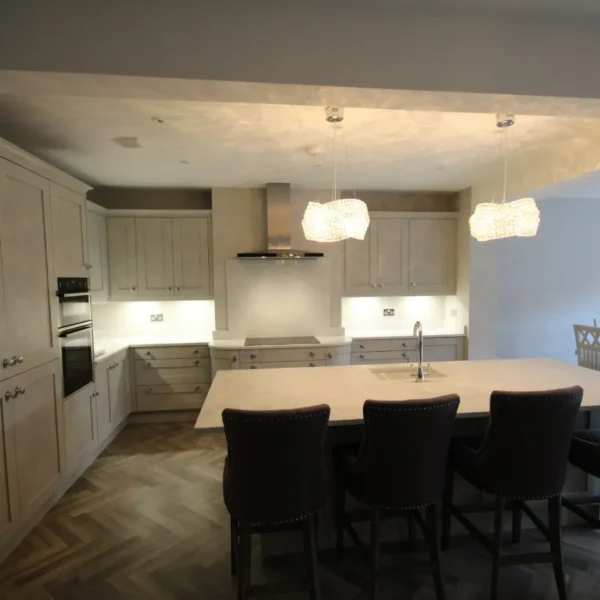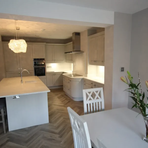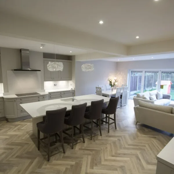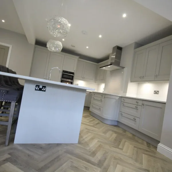 Our clients had a young family and wanted a space where they could all spend time together. They chose shaker doors in soft grey with snowflake mirror look quartz worktops, giving a classic yet modern feel to the kitchen.