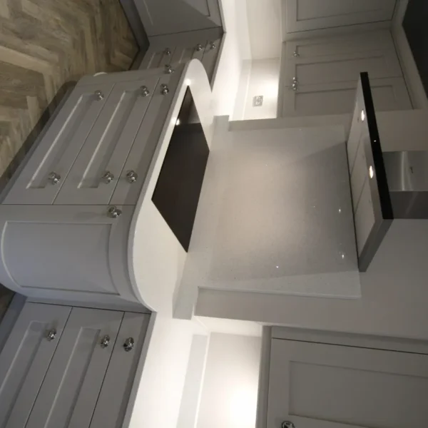 Rather than getting rid of the chimney breast which can be expensive, we used this as a feature. Curved units and quartz worktop with splash back provided the perfect space for the induction hob and a modern chrome extractor fan.
