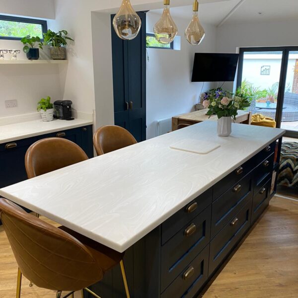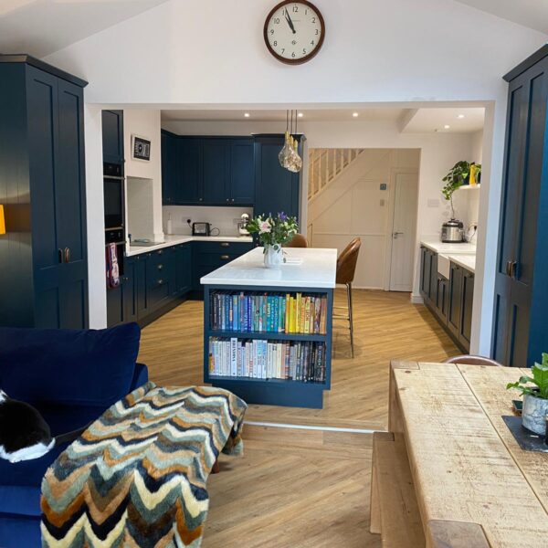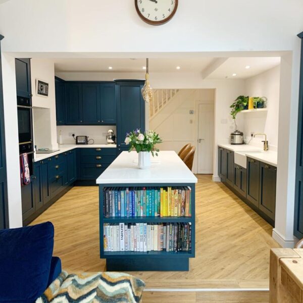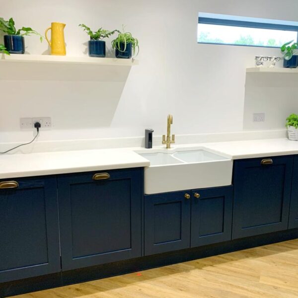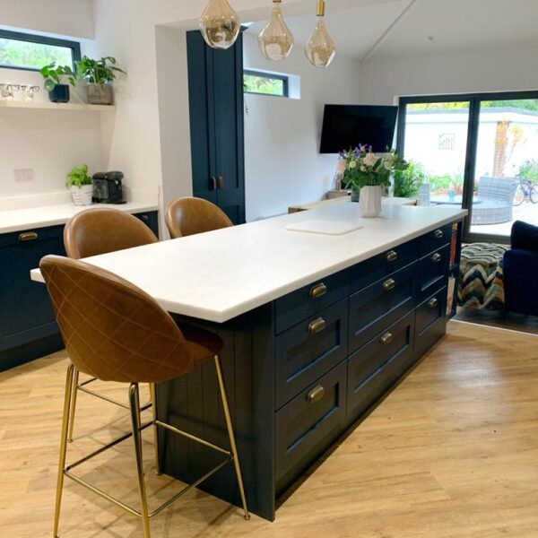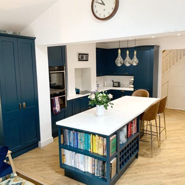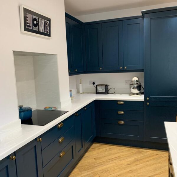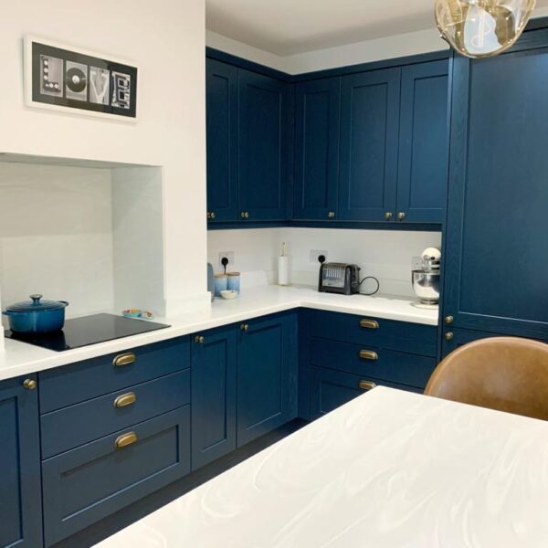 Our clients chose shaker doors in Hague blue; finished with brass handles and knobs. White onyx Corian worktops complemented the dark tones of the blue.