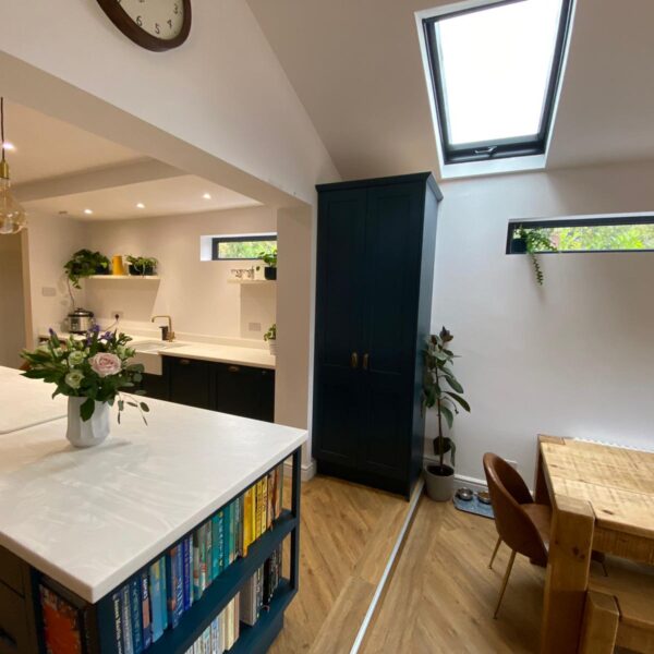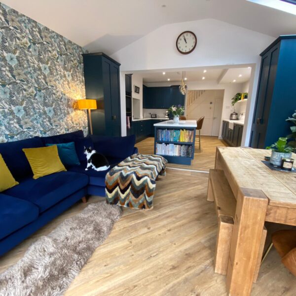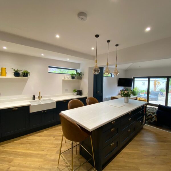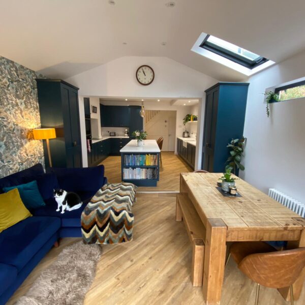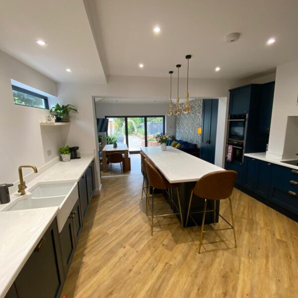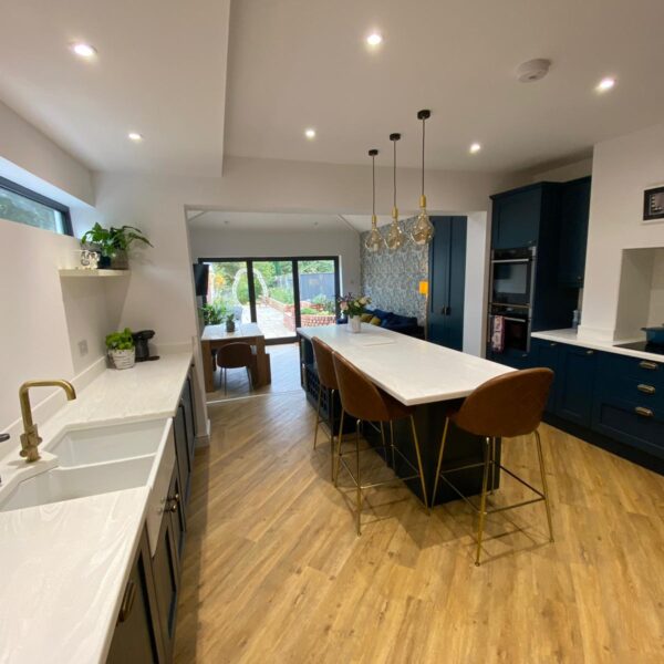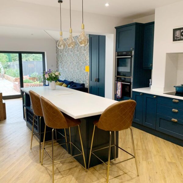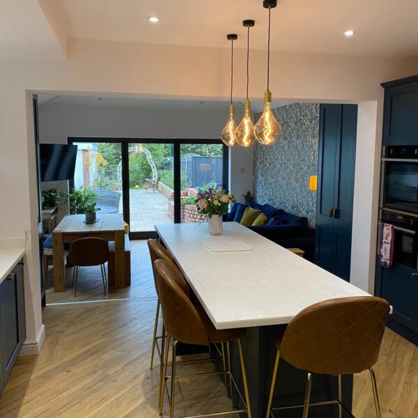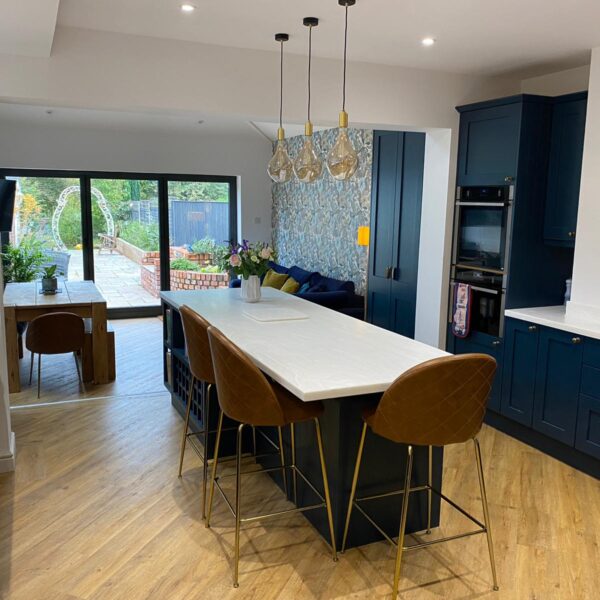 A vibrant open plan kitchen for clients in Halesowen. Our clients wanted to create an open plan space with bi-fold doors looking out into the garden. We worked in association with Atco Build to create the space that they were looking for.