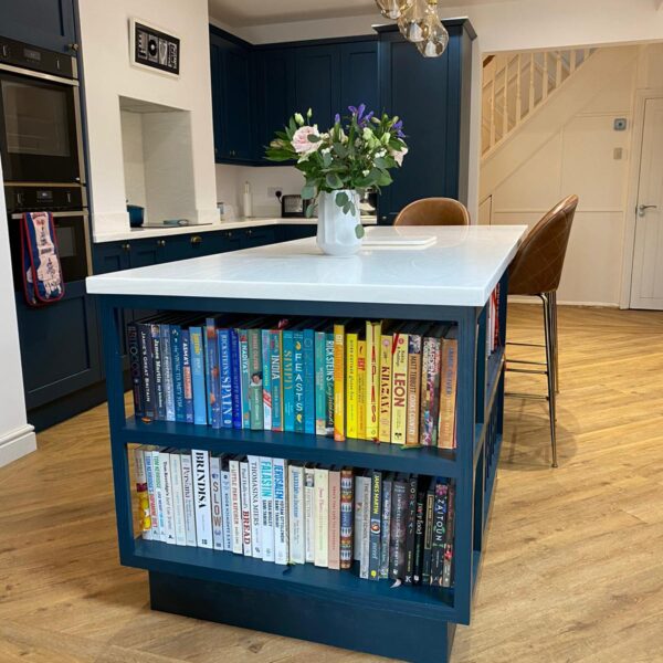 Above all, the fabulous island unit steals the show. With its open end bookcase for our clients many cookbooks; a wine rack, pan drawers to the rear and a breakfast bar for three.