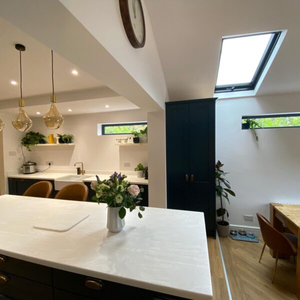 The chimney breast was used as a feature to house the induction hob. Two spacious pantry style cupboards at either end of the kitchen; provided plenty of additional storage.