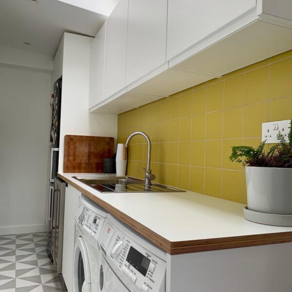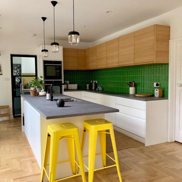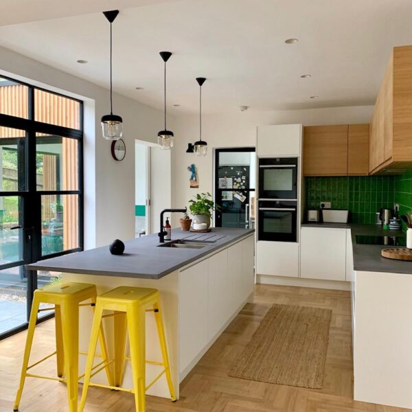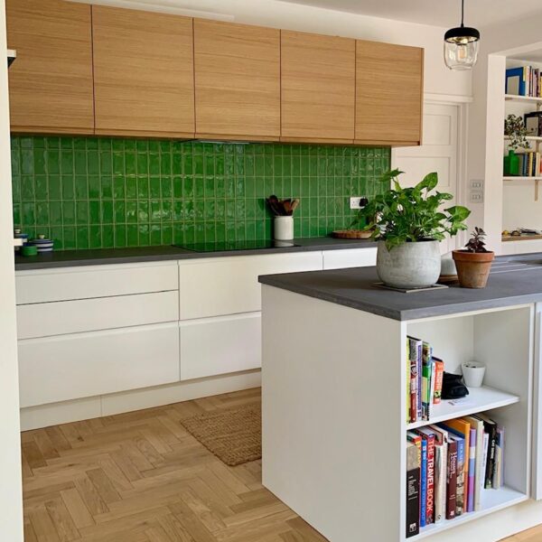 Rob contacted us following a recommendation from his builder who we had previously worked with. Our clients had a clear idea of what they wanted to achieve with a large concrete topped island being the focal point. They chose matt white J shaped handle doors for the island and base units, with natural oak J shaped handle wall units to complement the look and add warmth and character. The concrete worktops and vibrant green tiles complete the modern look.