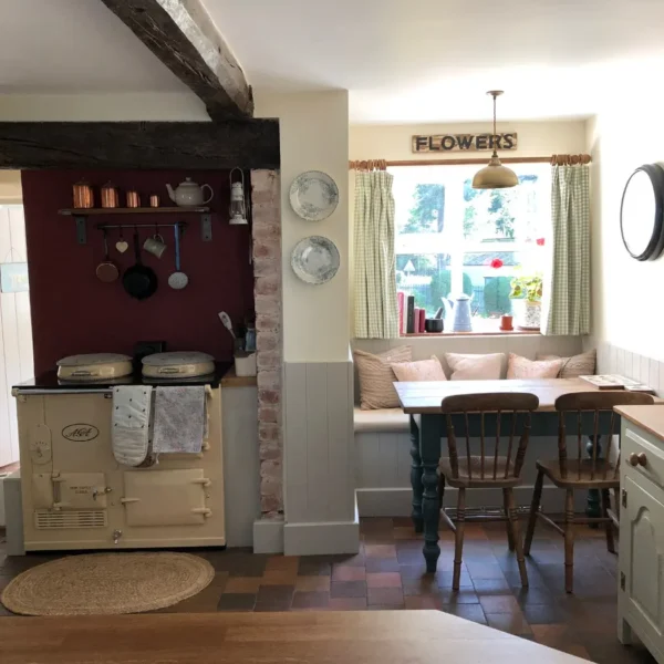 A 70 year old aga was the centre piece of the kitchen; so we designed the kitchen around this. Tongue and groove panelling added to the country feel and a cosy dining area was created with banquette seating.