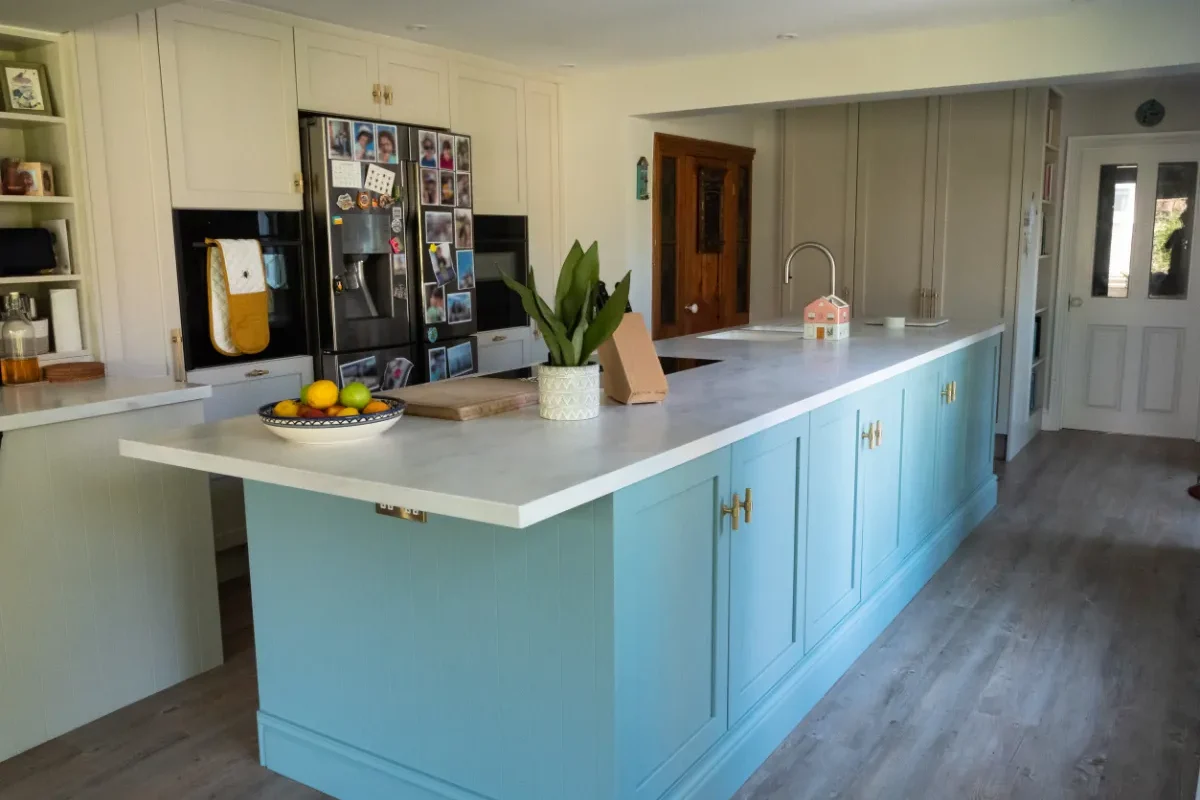We went for a Skinny Shaker style, a modern take on a classic. To add visual interest and define different areas of the space, we used two colourways: