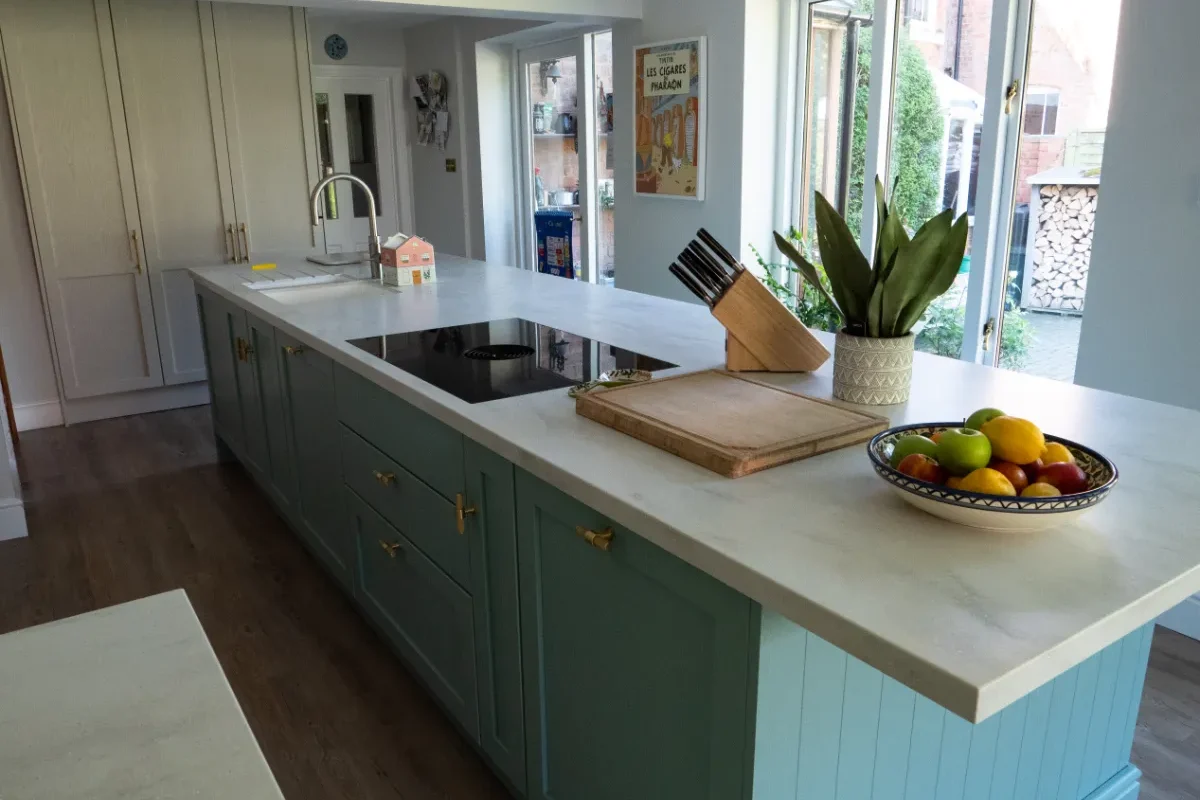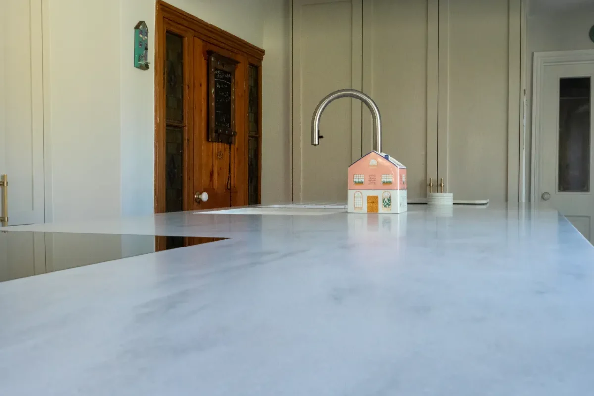 We chose 38mm thick Corian in Raincloud for the main kitchen worktops. For the integrated sink, we used Corian in Glacier White, which is a seamless, hygienic surface that’s easy to clean and maintain.
