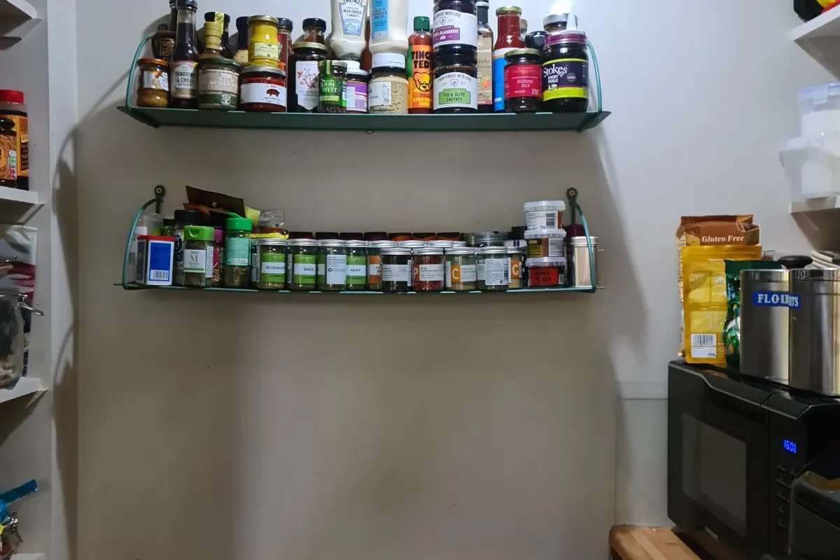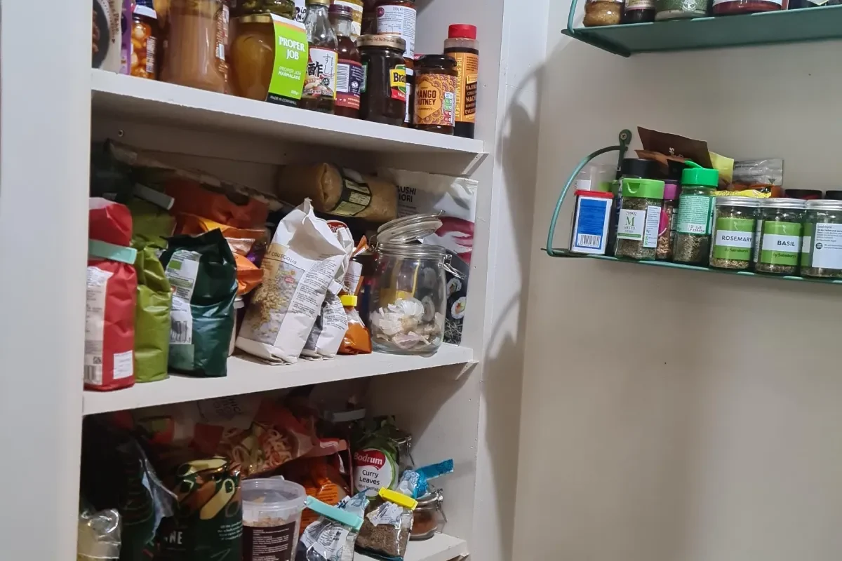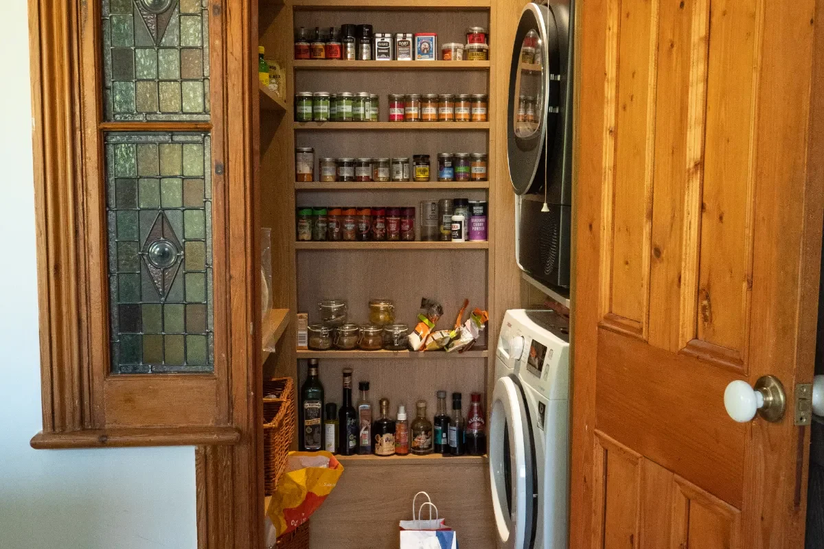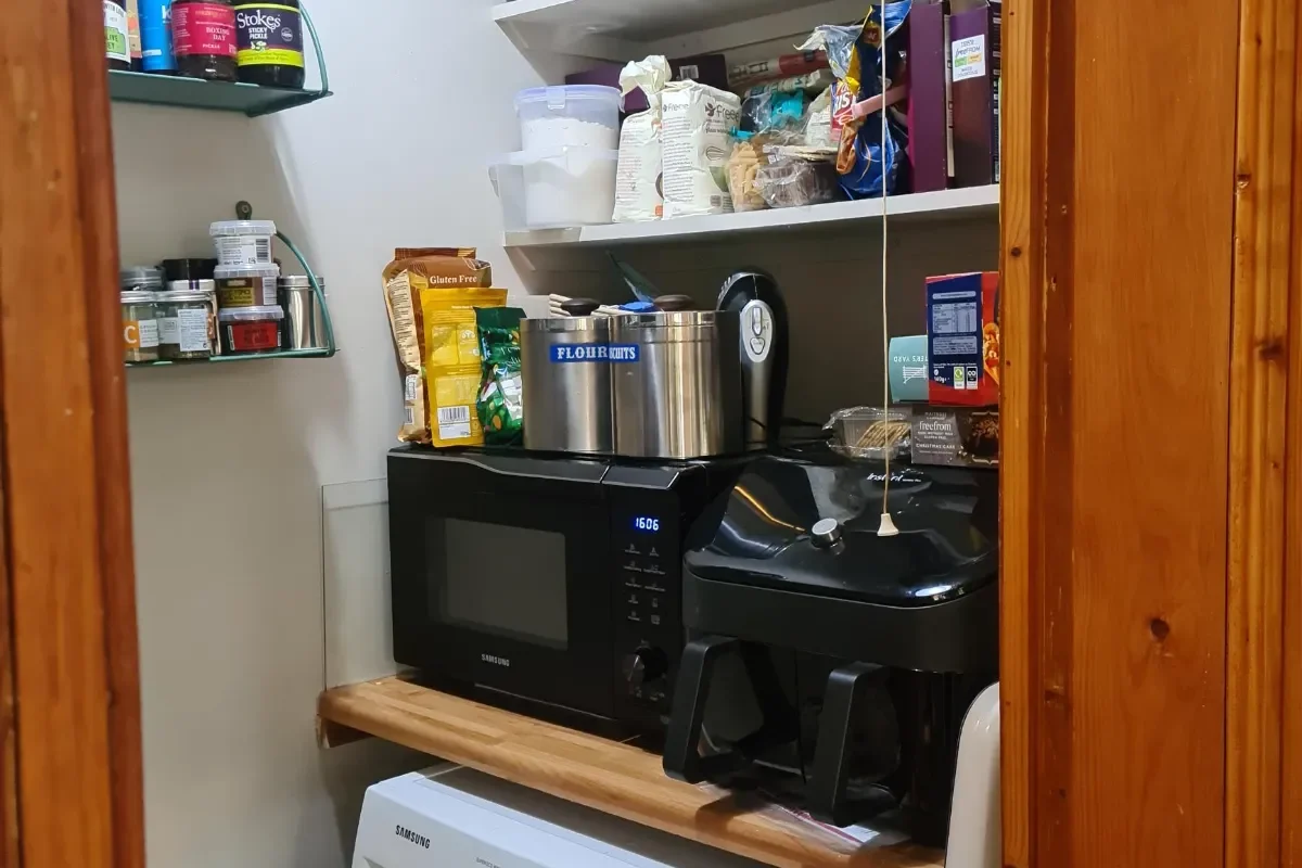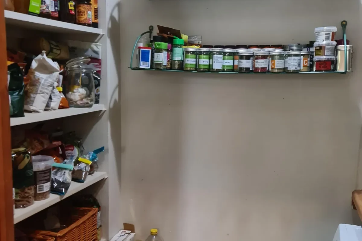 - A full-height larder unit with adjustable shelving is used for the storage of various-sized items.