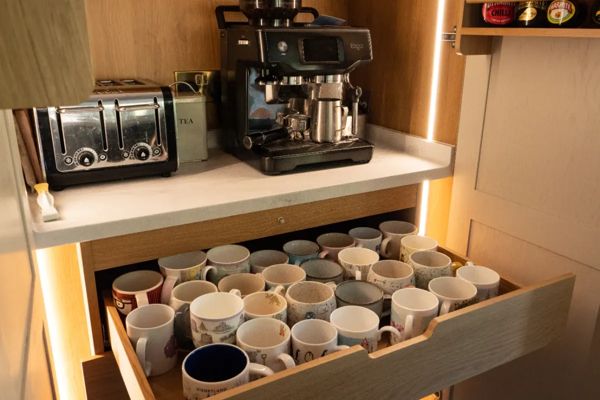 - We created a space for a coffee machine, so now the utility area is a bit luxurious, and we’ve freed up space in the main kitchen.