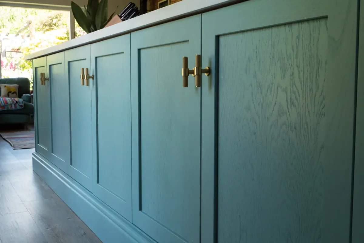 - A custom colour-matched Farrow & Ball Arsenic for the island, a focal point that adds personality to the room.