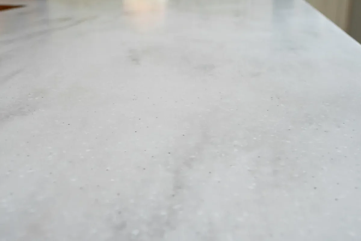 - We chose a gorgeous Corian worktop in Raincloud. This material looks luxurious and is durable and low maintenance, perfect for a family kitchen.