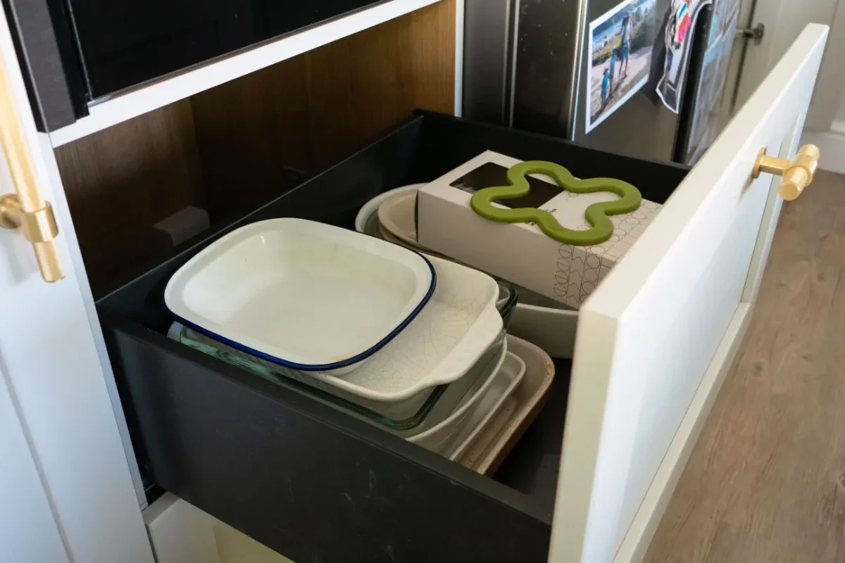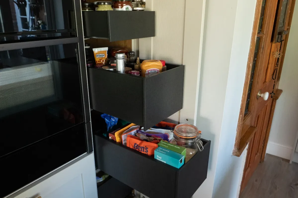 - We used dovetail drawers in the pantry and hob area, which are traditional craftsmanship, quality, and durability.