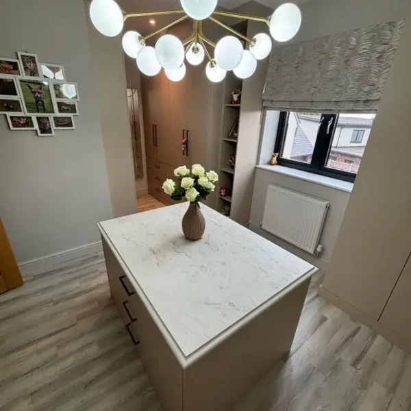 The neutral palette works beautifully with the natural light, while the brass detailing introduces warmth and character. The island adds both practicality and presence, turning the room into more than just storage – it becomes a place to start and end the day with ease.