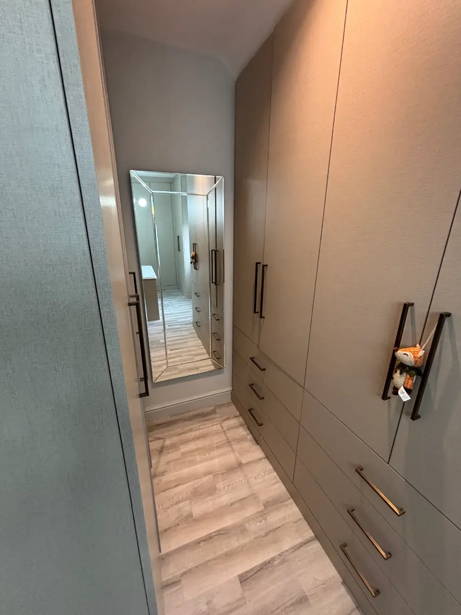 The client required significant storage without the room feeling enclosed. We achieved this by integrating a mix of full-height wardrobes, drawer banks, and open shelving – allowing the space to breathe while still delivering exceptional capacity.