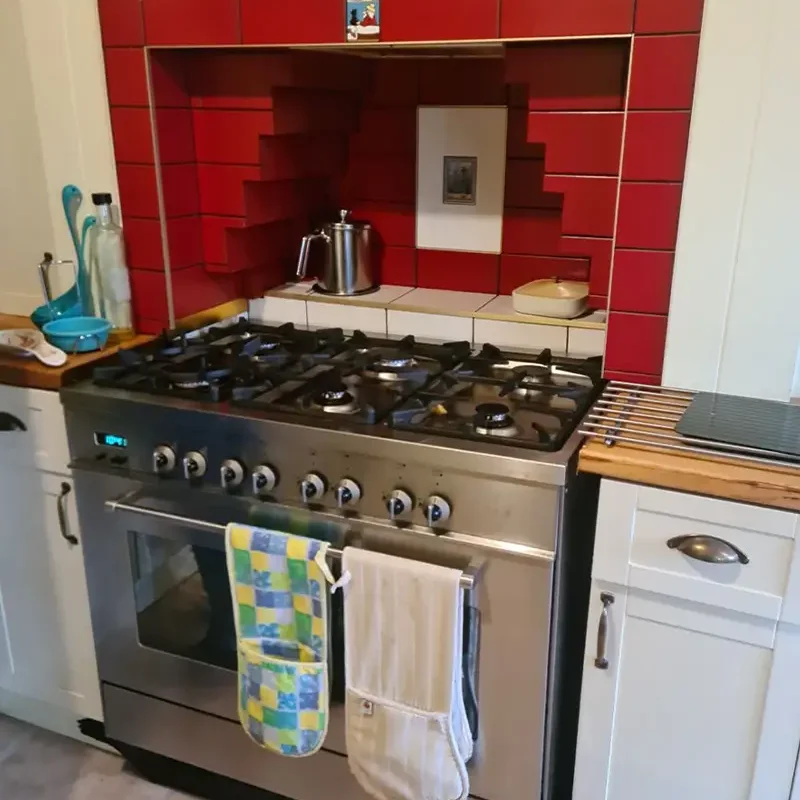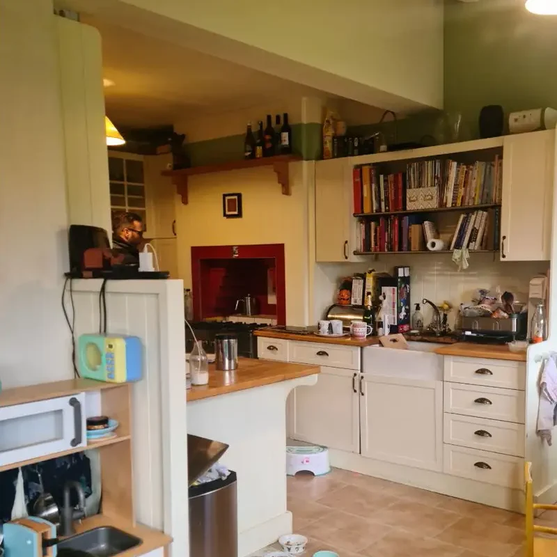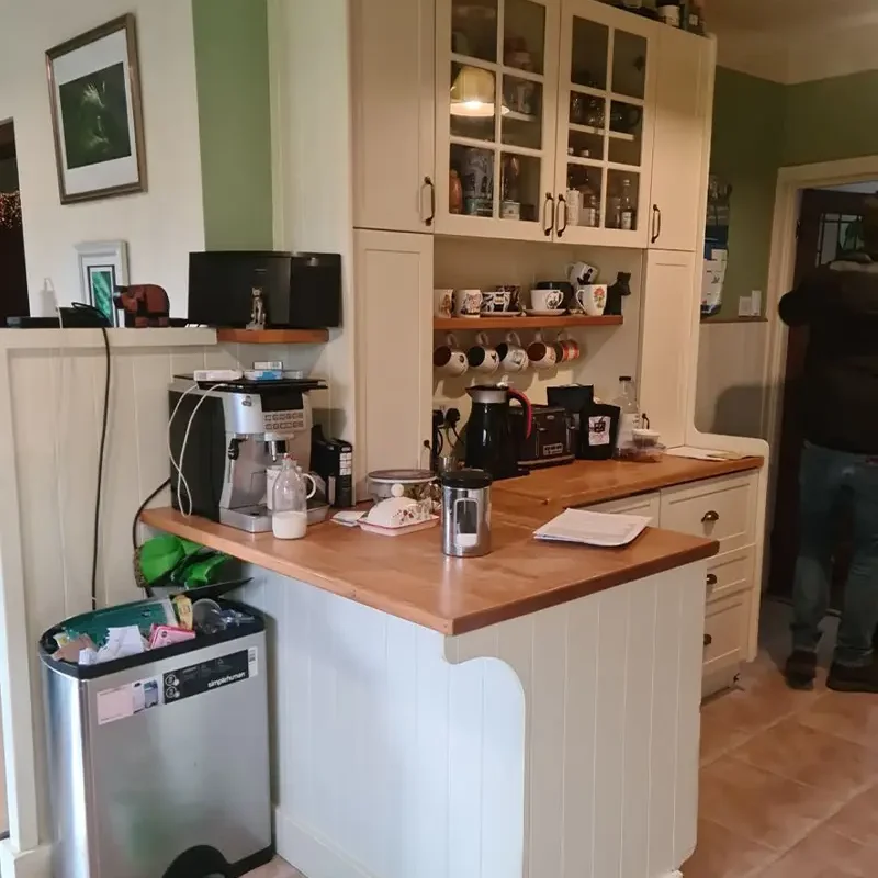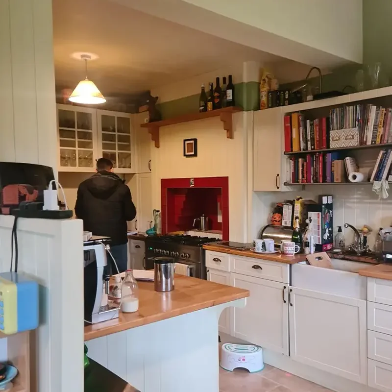 The built in ovens found a new home opposite the chimney breast. A dedicated cooking station that no longer gets in the way of other kitchen activities. This small detail makes a big difference in daily use.We got creative with the chimney breast – often a design obstacle – and turned it into a sophisticated drinks and coffee station. This bespoke area is now a functional morning coffee spot and an elegant entertaining space when they have friends over, adding a touch of luxury to the practical kitchen.