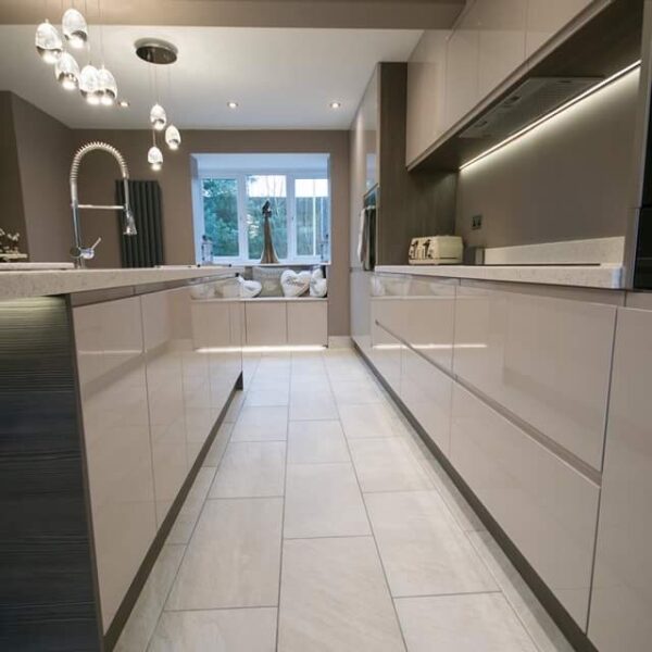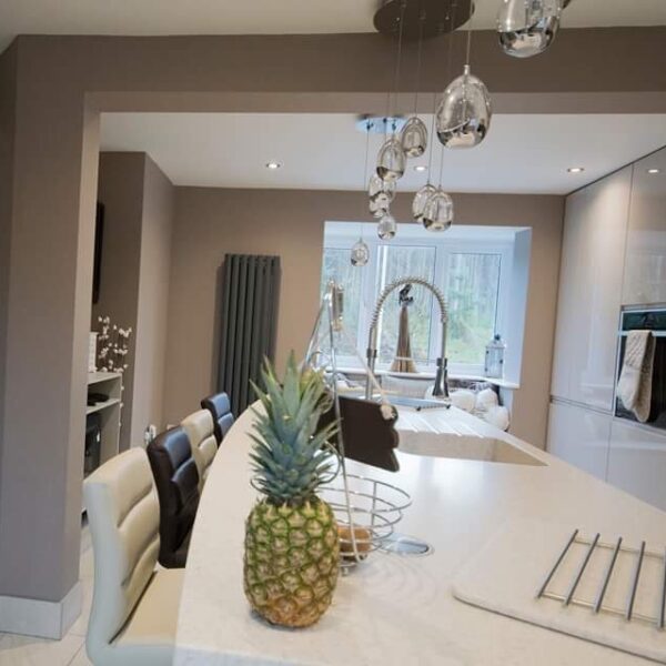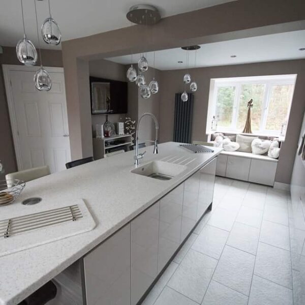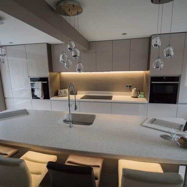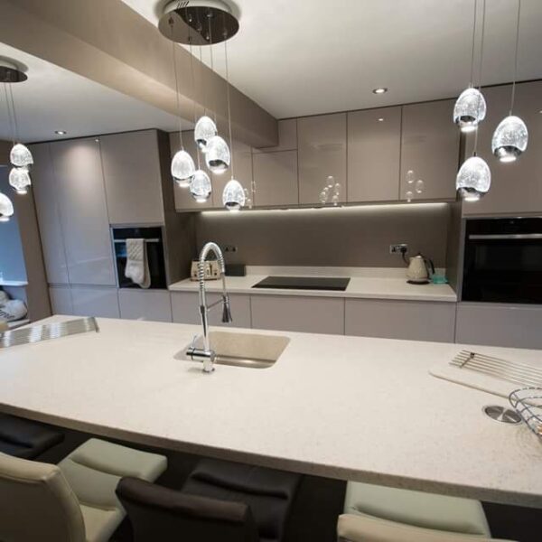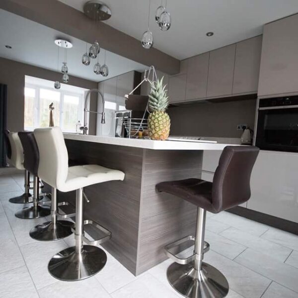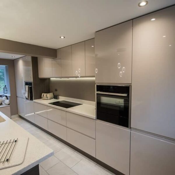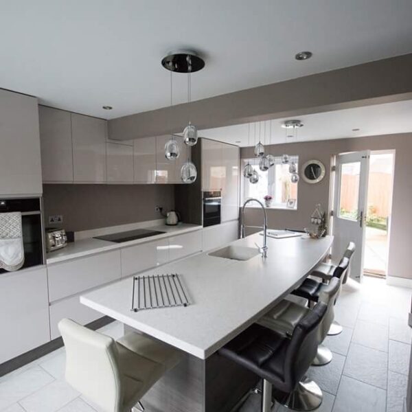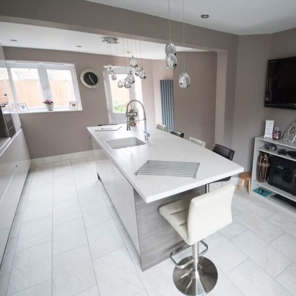 A stunning gloss handle less kitchen for a family in Cradley Heath. They had a small kitchen and dining room; which hardly got used and wanted to create a large kitchen dining area.