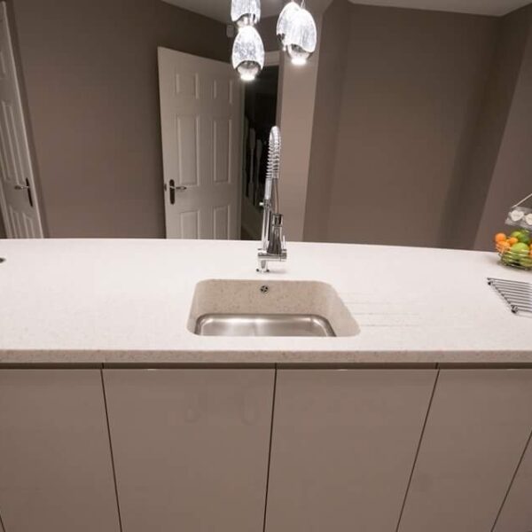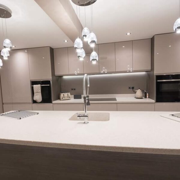 They chose gloss handle less doors in cashmere with end panels and accents in brown/grey avola. And hi-macs worktop in Tambora with a hi-macs combina sink.