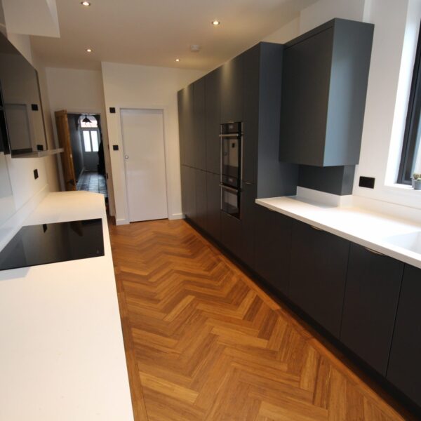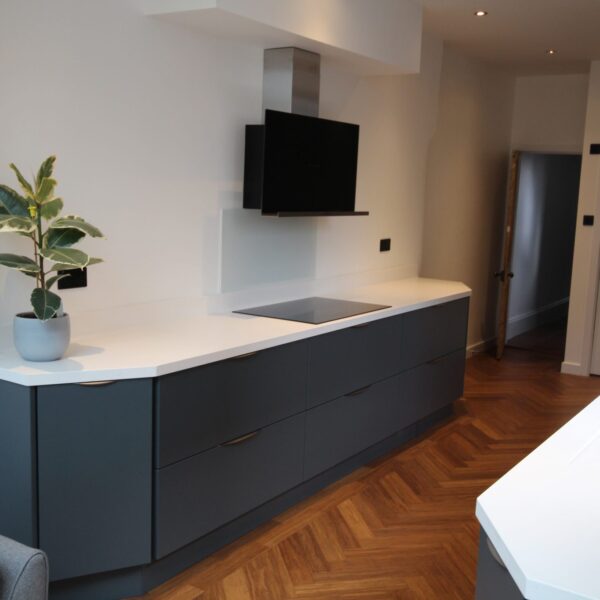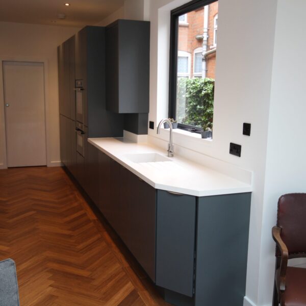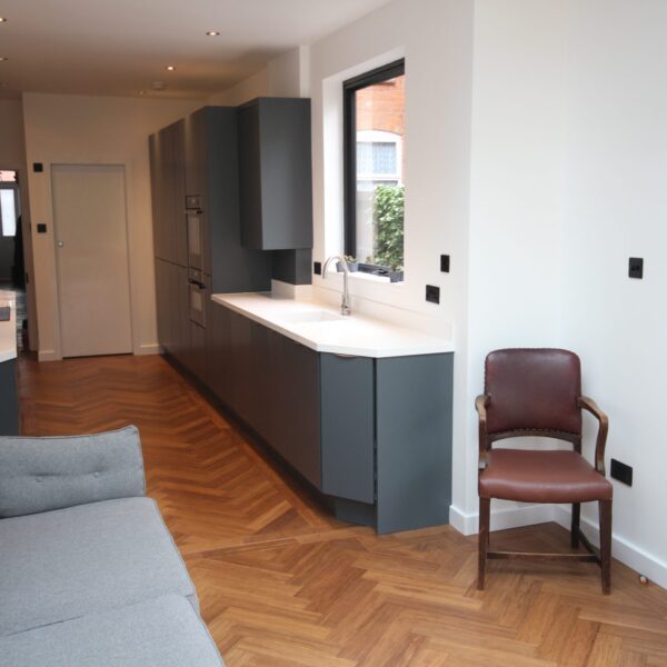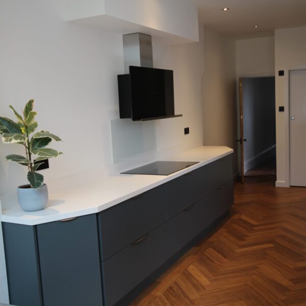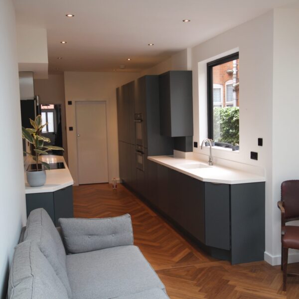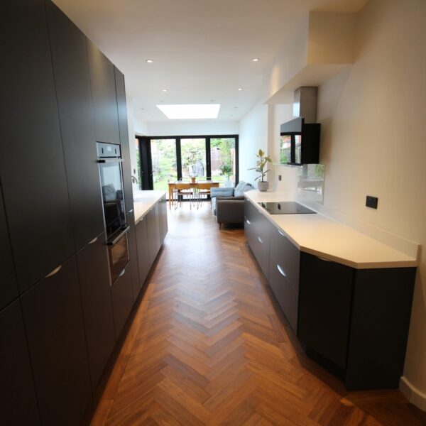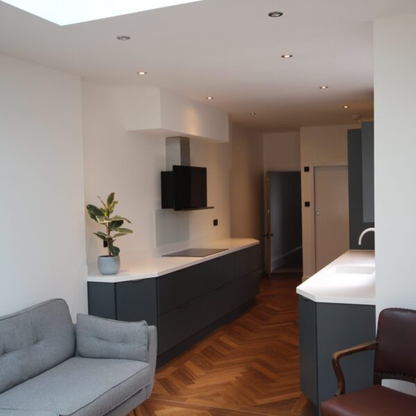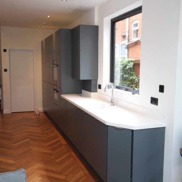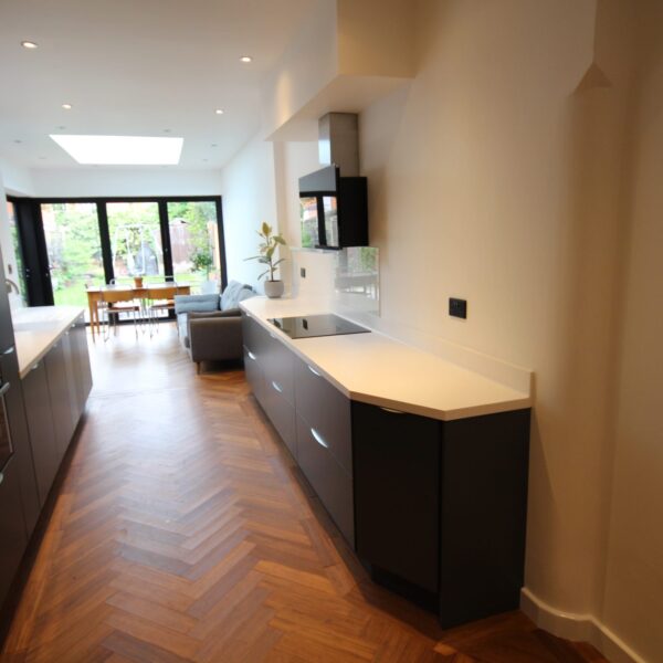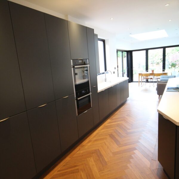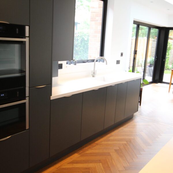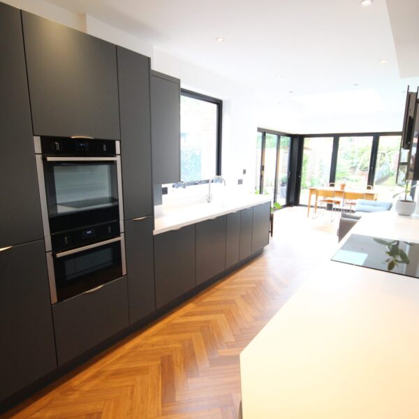 A sleek, modern, matt painted kitchen in Kings Heath; painted seal grey with medium edge bow handles. Our clients had a lovely town house; the kitchen had an unusable lean-to at the rear. There were also doors and windows in the wrong positions which made the kitchen difficult to use in a practical way. The lean-to was knocked down and replaced with an extension. This gave an open plan family area; with bi-fold doors overlooking their garden and a ceiling lantern filling the room with light.